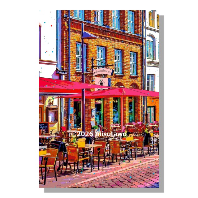 ドイツ リューベック旧市街のカフェテラスを、色鮮やかなグラフィックアートにしたポスターです。 ※額縁は付属しません。 ※受注後印刷になります。 --------------- サイズにより仕様と配送方法が異なります。 ■A4サイズ 配送方法:レターパックライト 用紙:フォト光沢紙 家庭用インクジェットで印刷した商品になります。 ※四方に以下の白フチがあります(おおよその寸法です)。 左右16mm 、上16mm、下29mm ■A3、B3、A2、B2、A1サイズ 配送方法:宅急便 用紙:フォト光沢紙 印刷所にて印刷した商品になります。 印刷所から直送になります。 ※四方に以下の白フチがあります(おおよその寸法です)。 A3:左右22mm 、上22mm、下41mm B3:左右28mm 、上28mm、下50mm A2:左右32mm 、上32mm、下58mm B2:左右39mm 、上39mm、下71mm A1:左右45mm 、上45mm、下82mm なお、A3、B3、A2、B2サイズは白フチなしも選択できます。 --------------- 画像には「©2026 misutawo」の著作権表示がありますが、お送りする作品には記載されておりません。 モニターの発色を印刷では完全に再現できない為、画像と実物の色合いが若干異なります。 ご了承下さいますようお願い致します。 #ポスター #A4 #A3 #A2 #B3 #B2 #アートポスター #ポップ #アート #グラフィックアート #カラフル #ビビッド #明るい #鮮やか #爽やか #リラックス #インテリア #シティポップ #癒し #風景 #景色 #旅行 #ヨーロッパ #ドイツ #北ドイツ #リューベック #街 #街角 #旧市街 #カフェ #レストラン #喫茶店 #飲食店 #カフェテラス #テラス #遊歩道 #石畳 #パラソル #レンガ #赤レンガ #テーブル #椅子 #建築 #中世 #歴史 #アンティーク #レトロ #コーヒー #珈琲