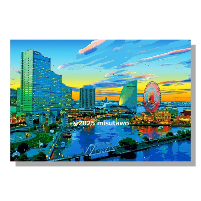横浜 夕暮れのみなとみらいを、色鮮やかなグラフィックアートにしたポスターです。 ※額縁は付属しません。 ※受注後印刷になります。 --------------- サイズにより仕様と配送方法が異なります。 ■A4サイズ 配送方法:レターパックライト 用紙:フォト光沢紙 家庭用インクジェットで印刷した商品になります。 ※四方に以下の白フチがあります(おおよその寸法です)。 左右22mm、上12mm、下19mm ■A3、B3、A2、B2、A1サイズ 配送方法:宅急便 用紙:フォト光沢紙 印刷所にて印刷した商品になります。 印刷所から直送になります。 ※四方に以下の白フチがあります(おおよその寸法です)。 A3:左右32mm、上18mm、下27mm B3:左右39mm、上22mm、下33mm A2:左右45mm、上25mm、下38mm B2:左右55mm、上31mm、下47mm A1:左右64mm、上36mm、下54mm なお、A3、B3、A2、B2サイズは白フチなしも選択できます。 --------------- 画像には「©2025 misutawo」の著作権表示がありますが、お送りする作品には記載されておりません。 モニターの発色を印刷では完全に再現できない為、画像と実物の色合いが若干異なります。 ご了承下さいますようお願い致します。 #ポスター #A4 #A3 #A2 #A1 #B3 #B2 #アートポスター #ポップ #アート #イラスト #カラフル #ビビッド #明るい #鮮やか #爽やか #リラックス #インテリア #シティポップ #風景 #景色 #旅行 #日本 #神奈川 #横浜 #みなとみらい #街 #街並み #港町 #ベイエリア #観覧車 #コスモクロック21 #夕暮れ #夕焼け #黄昏 #マジックアワー #トワイライト #海 #海辺 #船 #ボート #マリン #リゾート