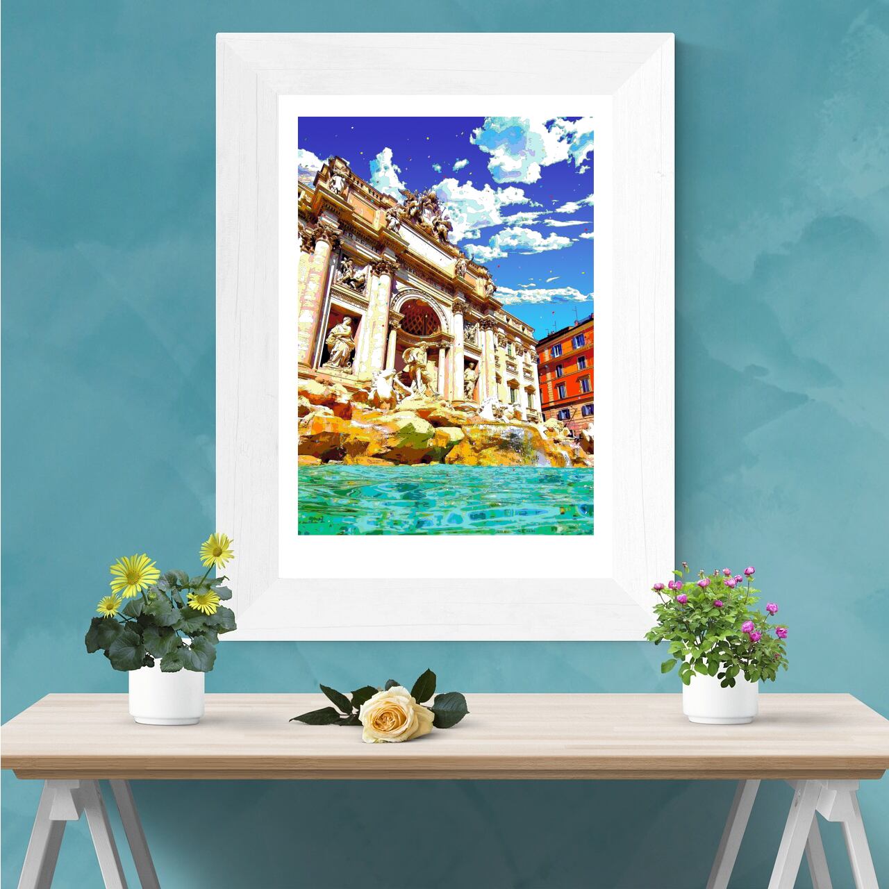 ローマ 青空に煌めくトレビの泉を、色鮮やかなグラフィックアートにしたポスターです。