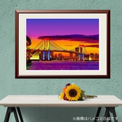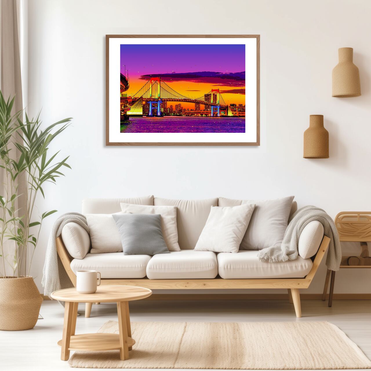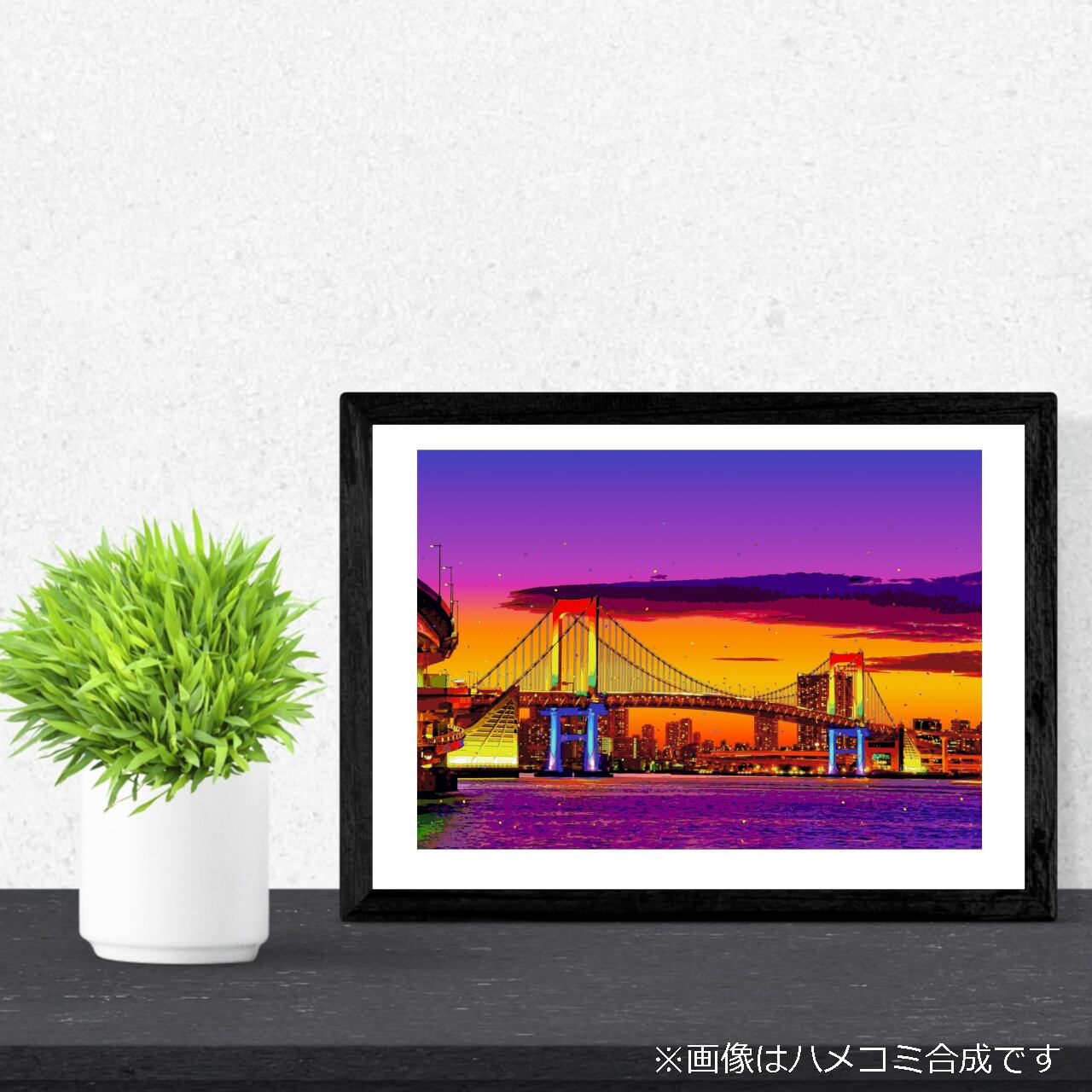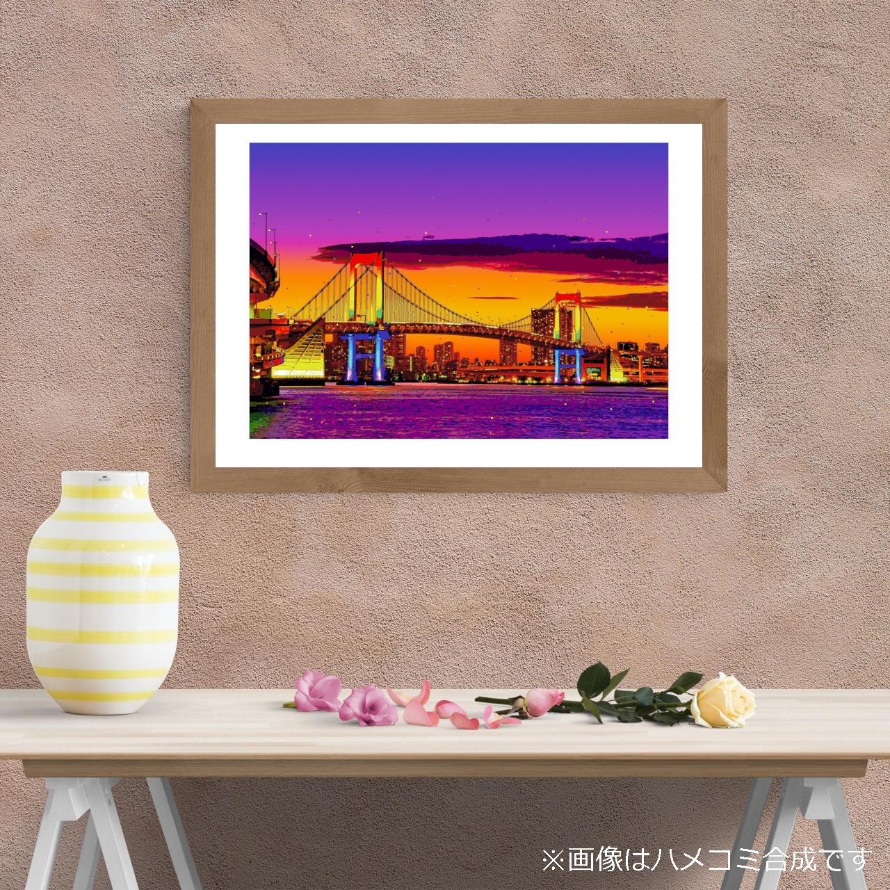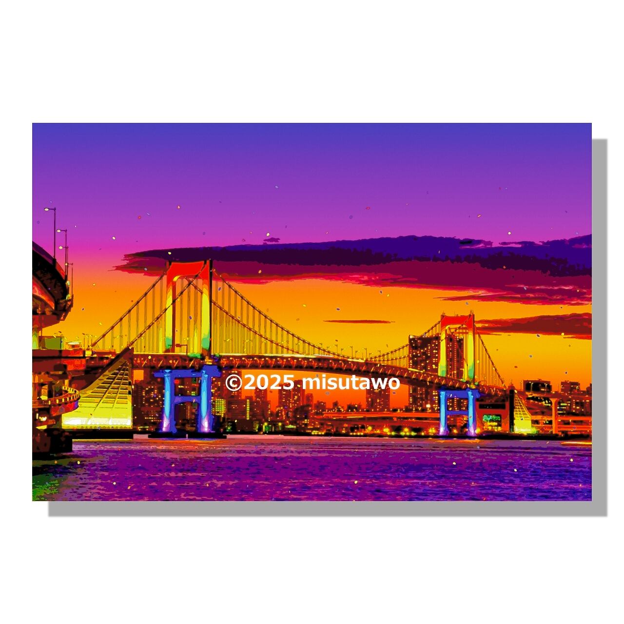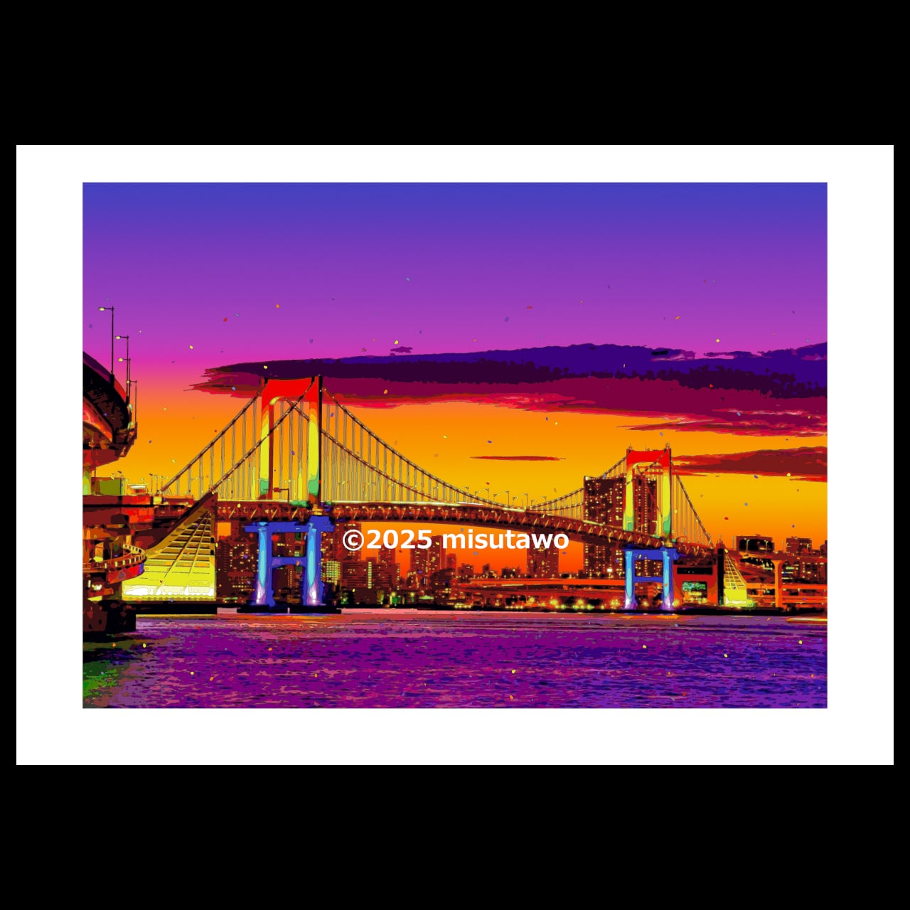 東京 夕暮れのレインボーブリッジを、色鮮やかなグラフィックアートにしたポスターです。