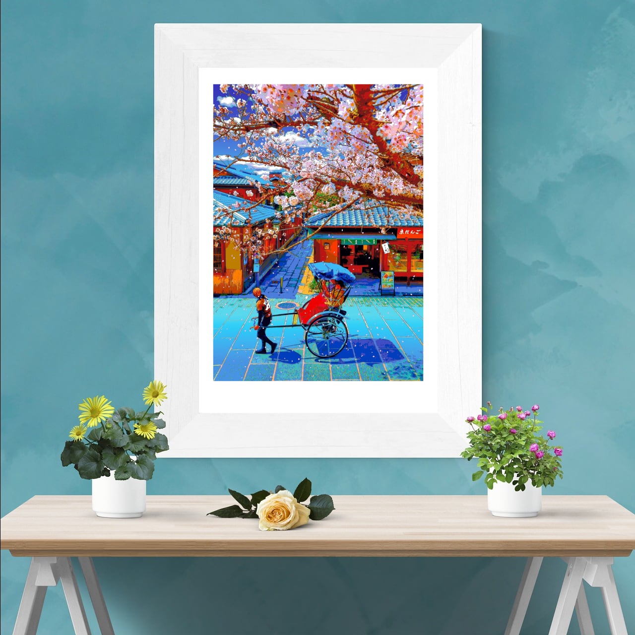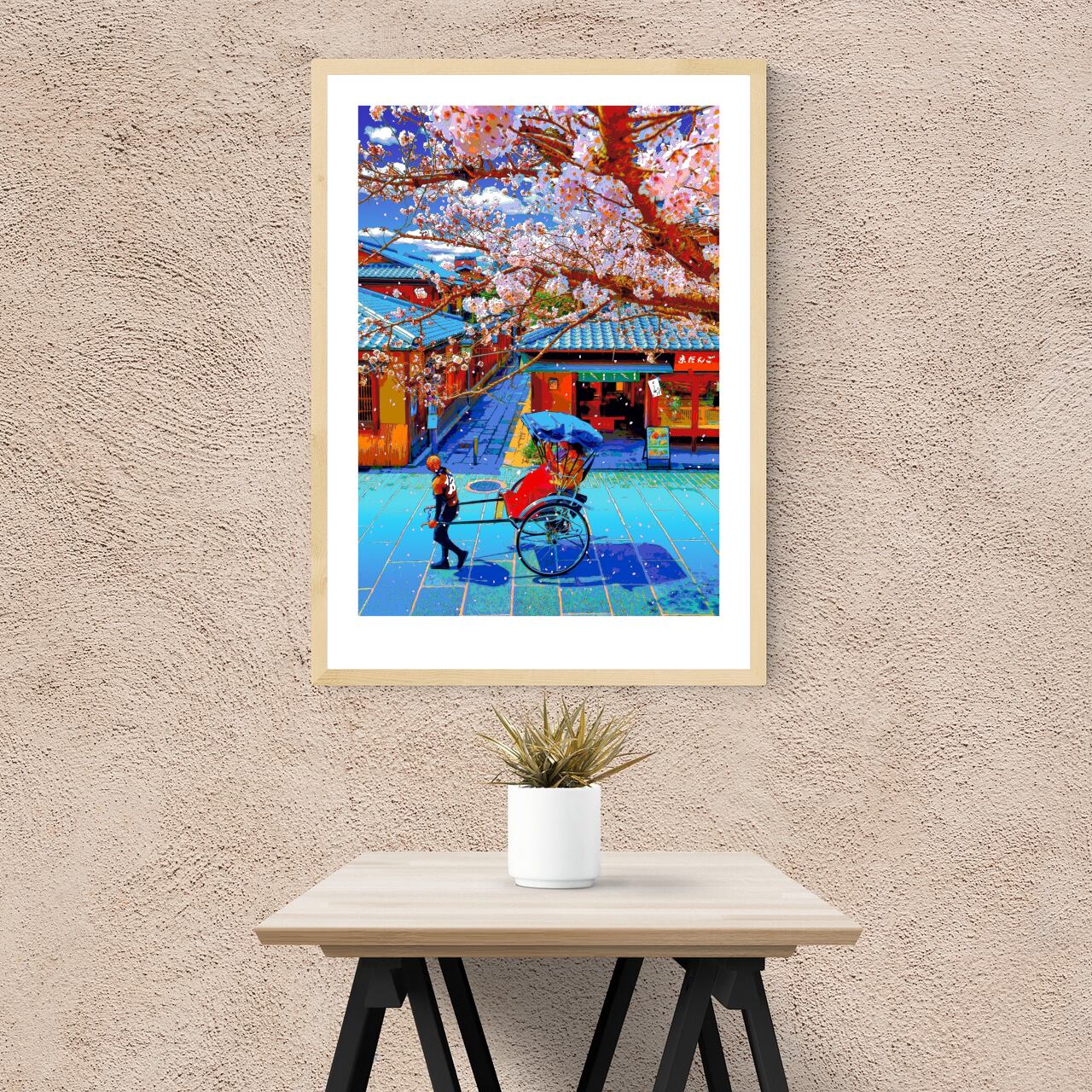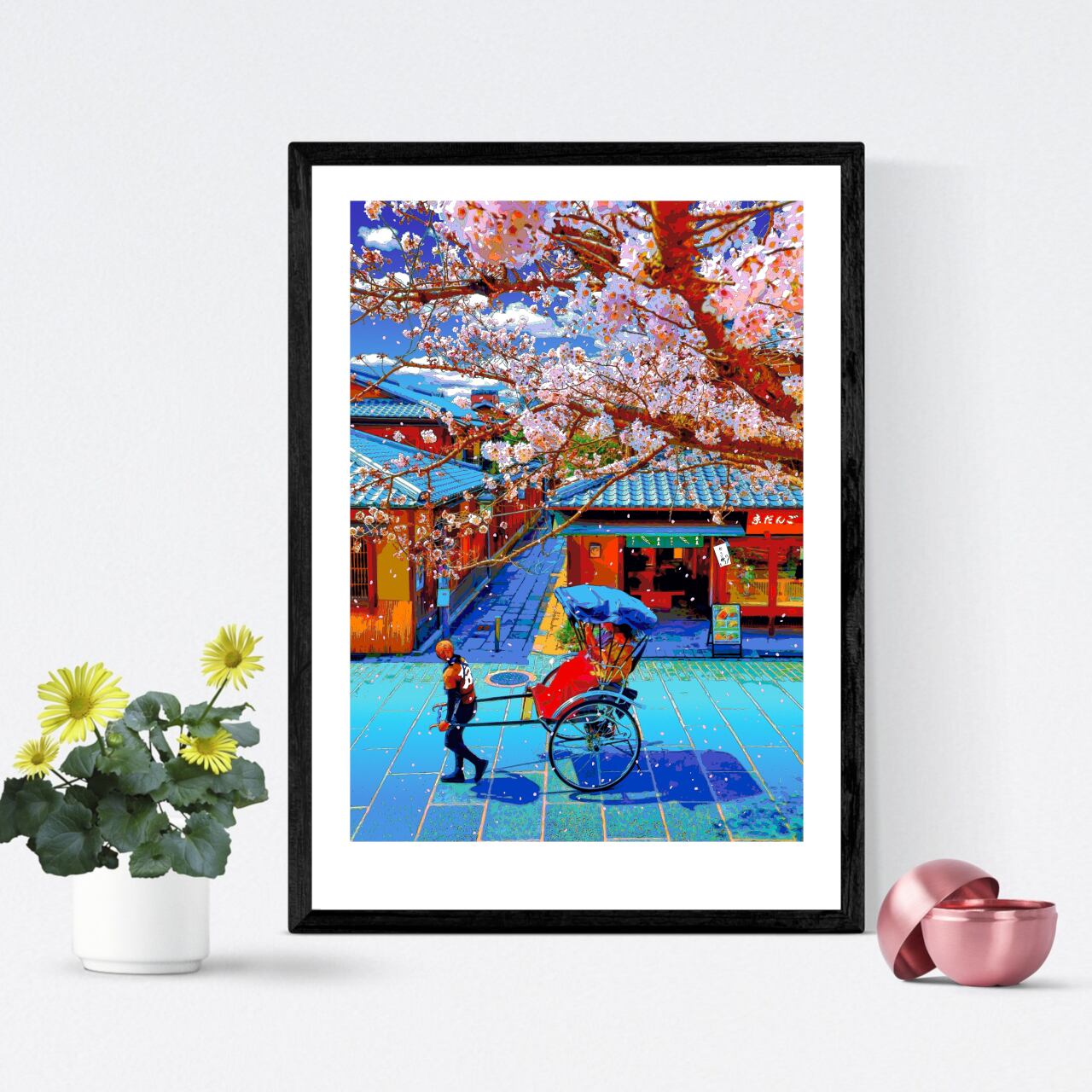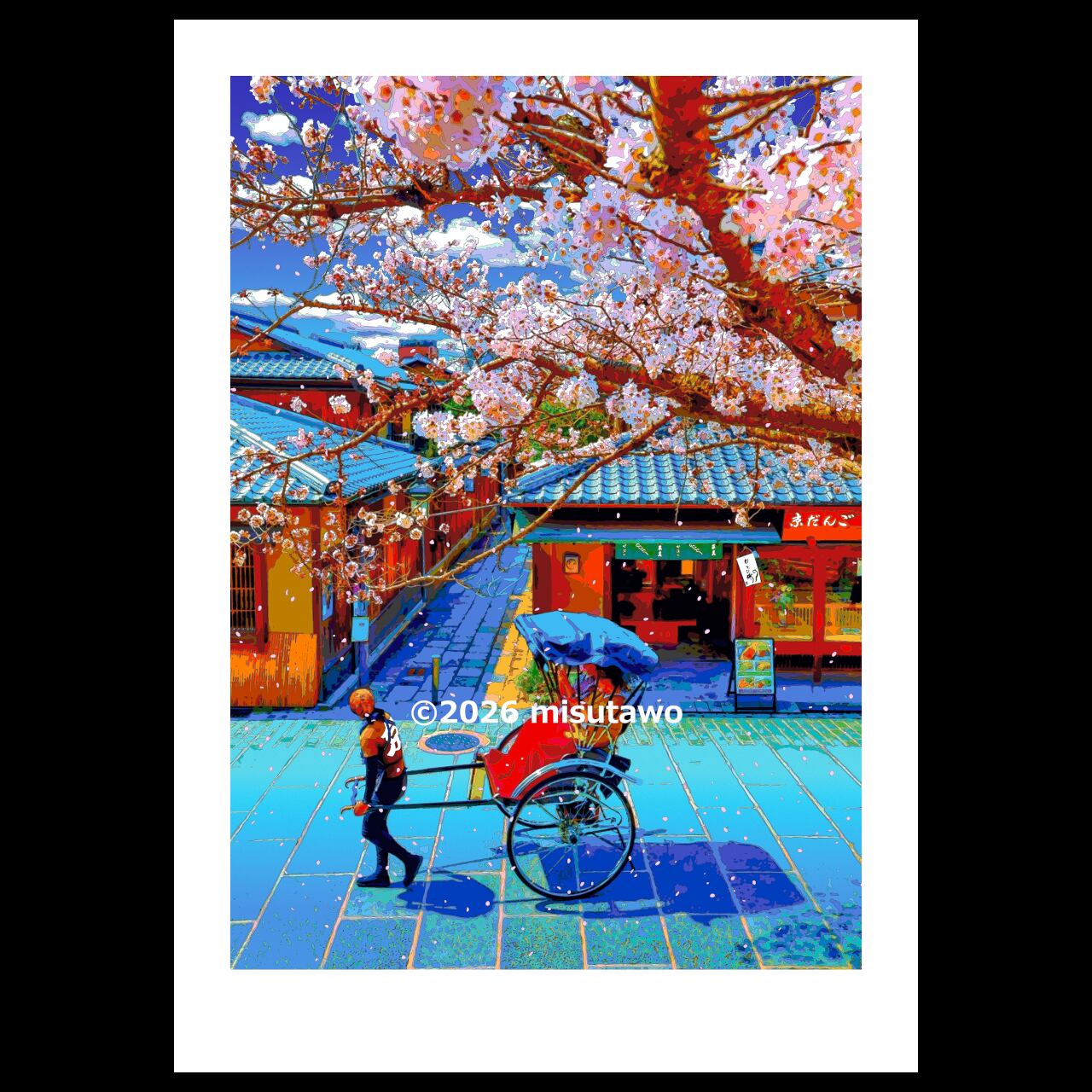 京都 ねねの道に咲く春を、色鮮やかなグラフィックアートにしたポスターです。