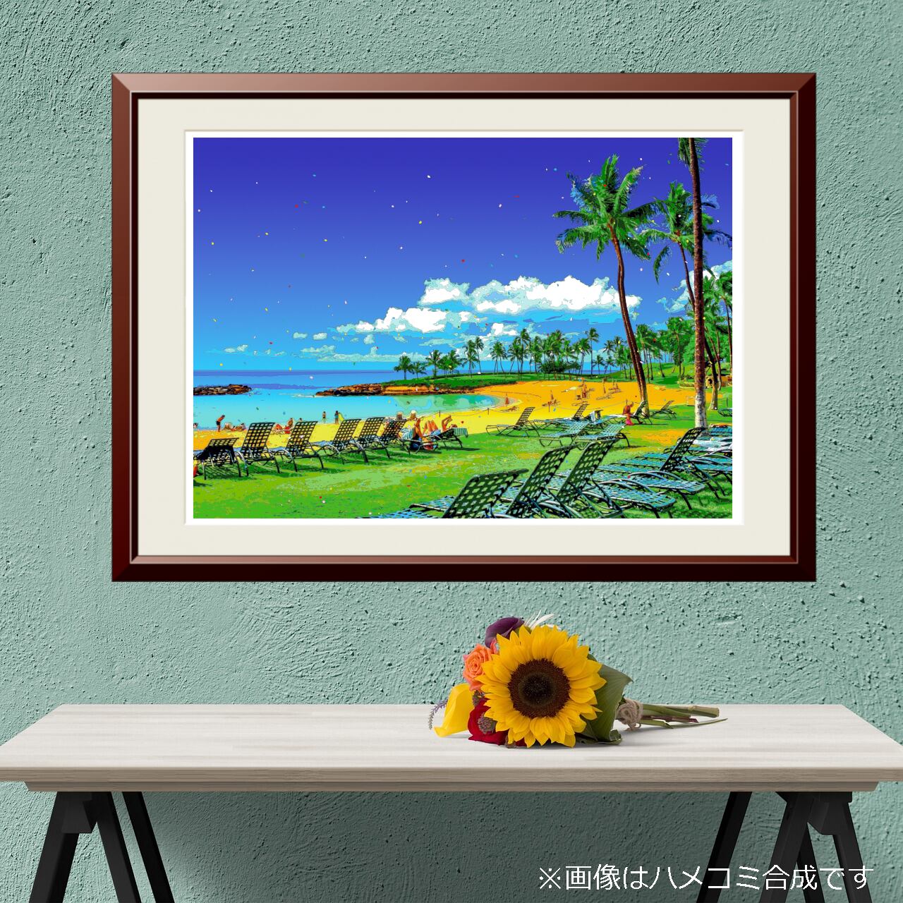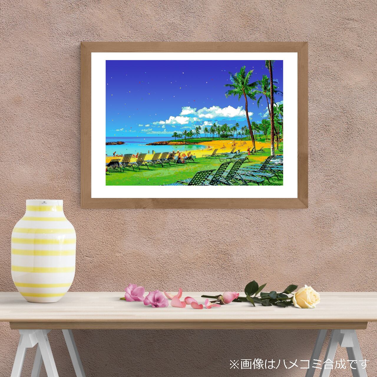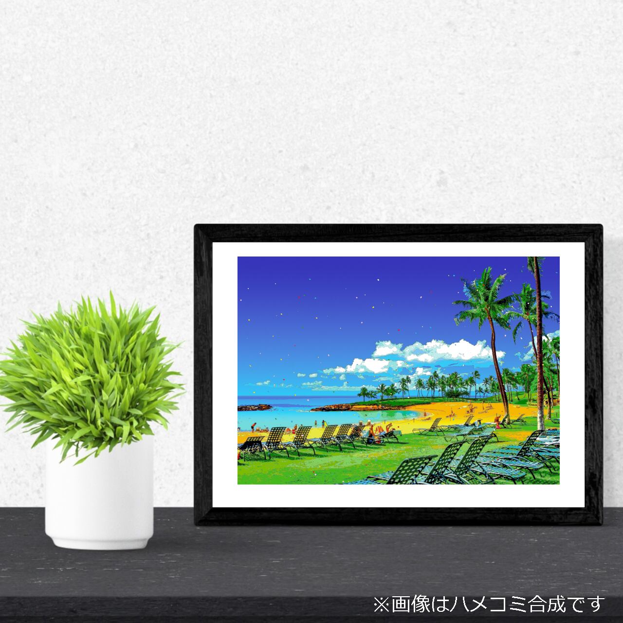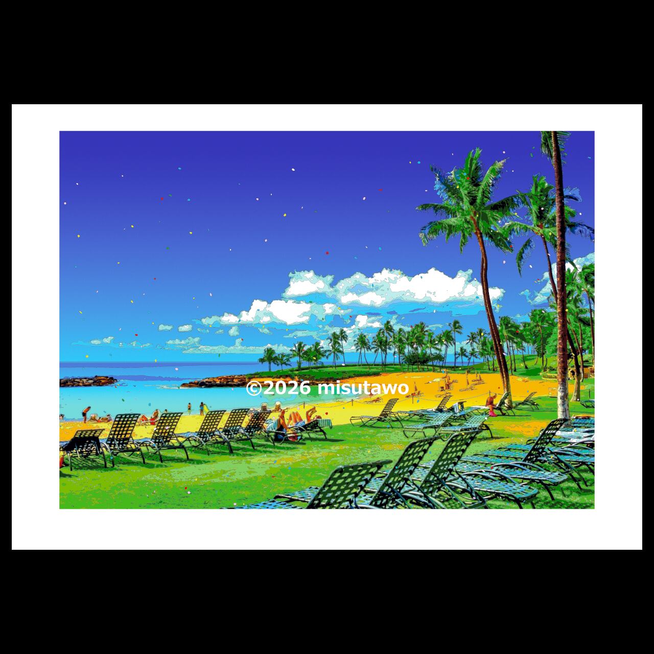 ハワイ 海辺のリゾートタイムを、色鮮やかなグラフィックアートにしたポスターです。