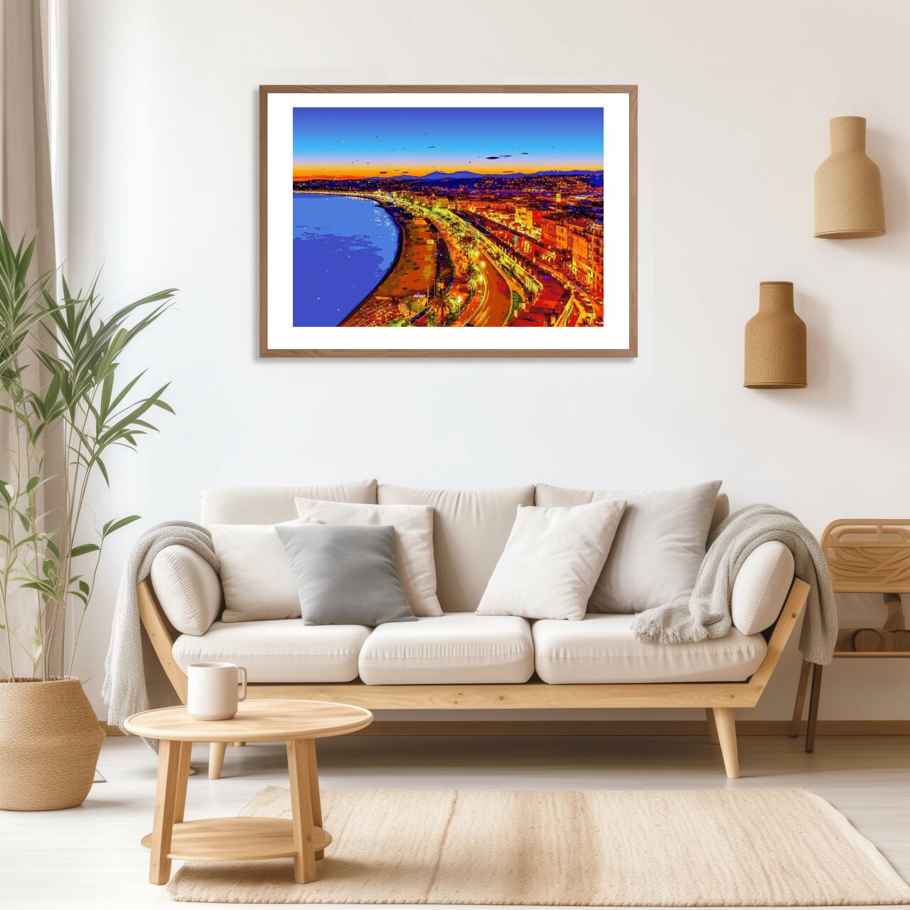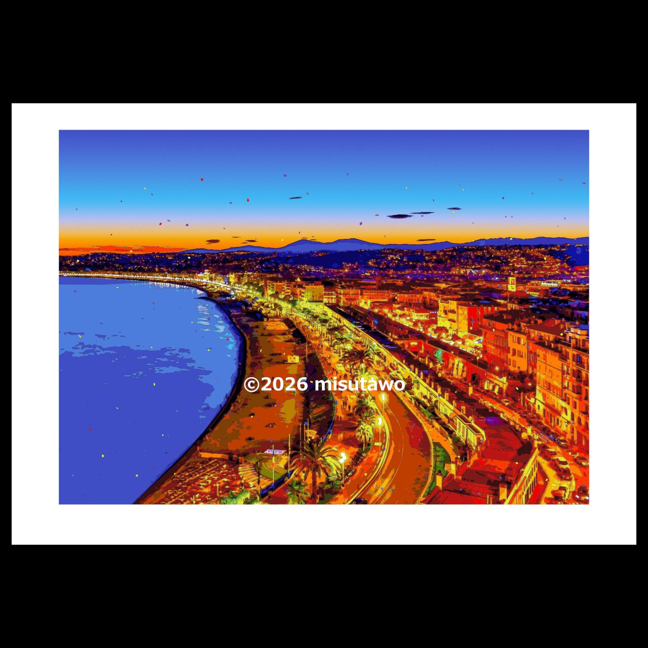 フランス 夕暮れのニースを、色鮮やかなグラフィックアートにしたポスターです。