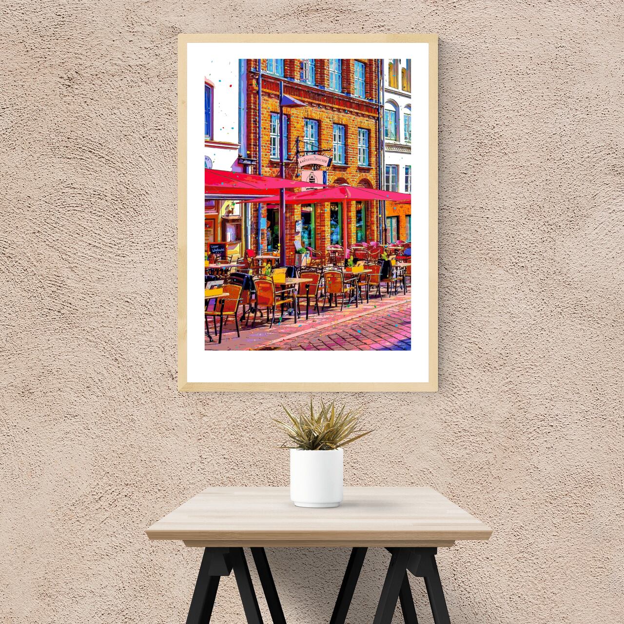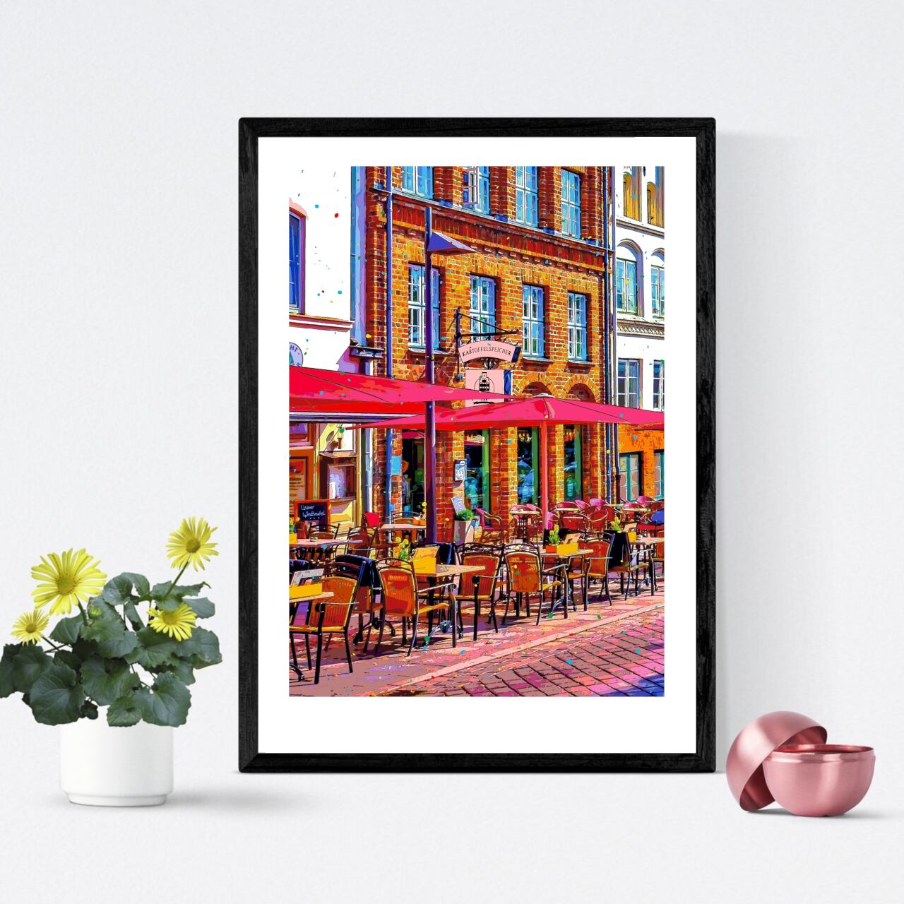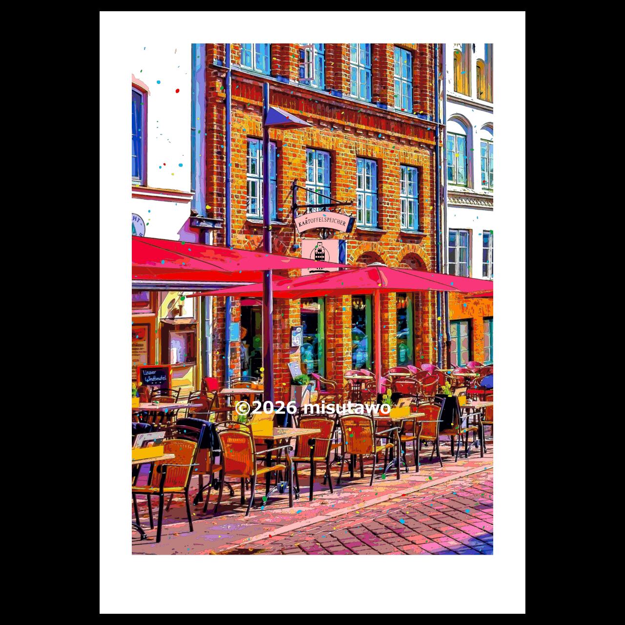 ドイツ リューベック旧市街のカフェテラスを、色鮮やかなグラフィックアートにしたポスターです。
