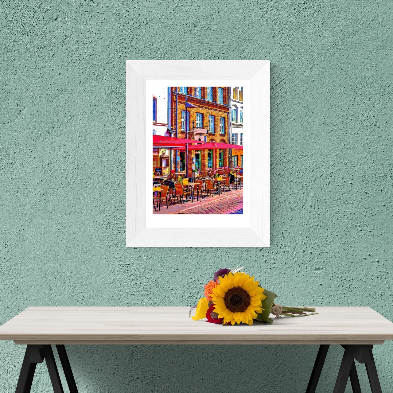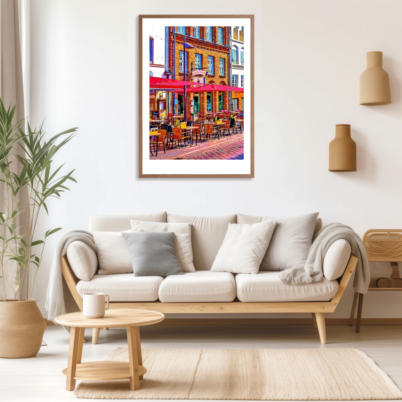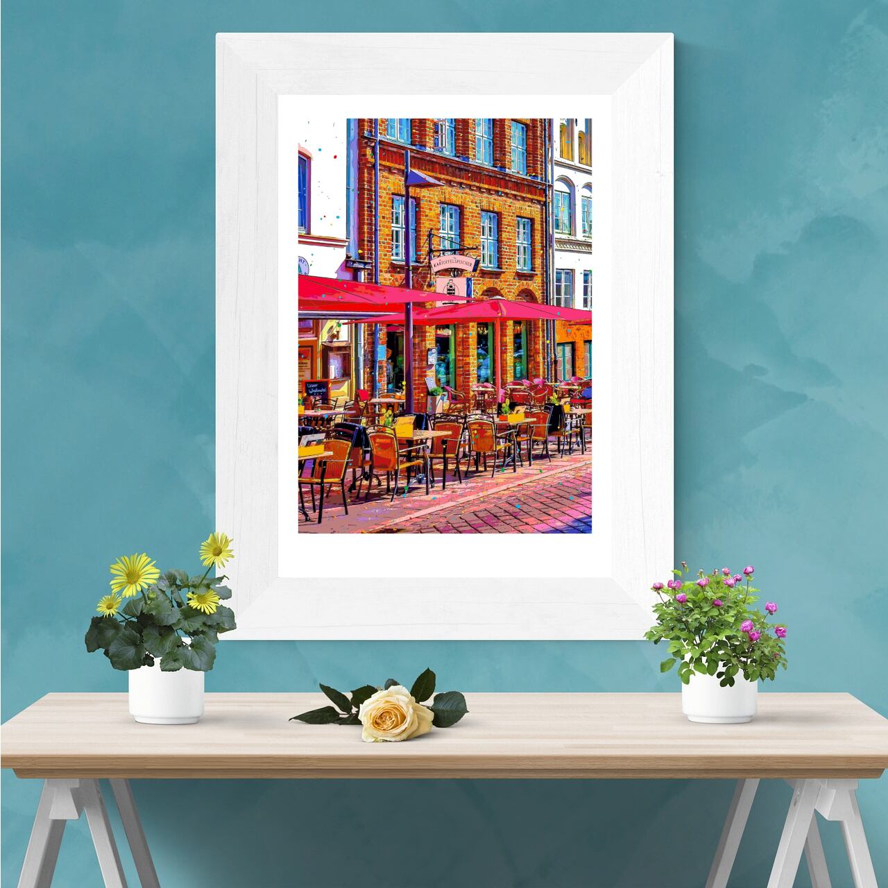 ドイツ リューベック旧市街のカフェテラスを、色鮮やかなグラフィックアートにしたポスターです。