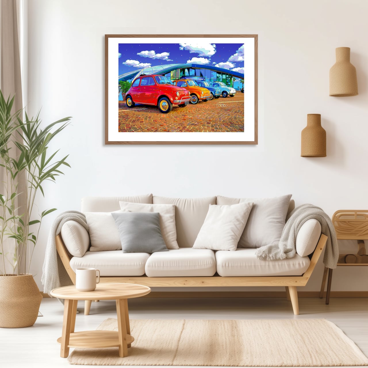 マルタ島のカラフルなクラシックカーを、色鮮やかなグラフィックアートにしたポスターです。