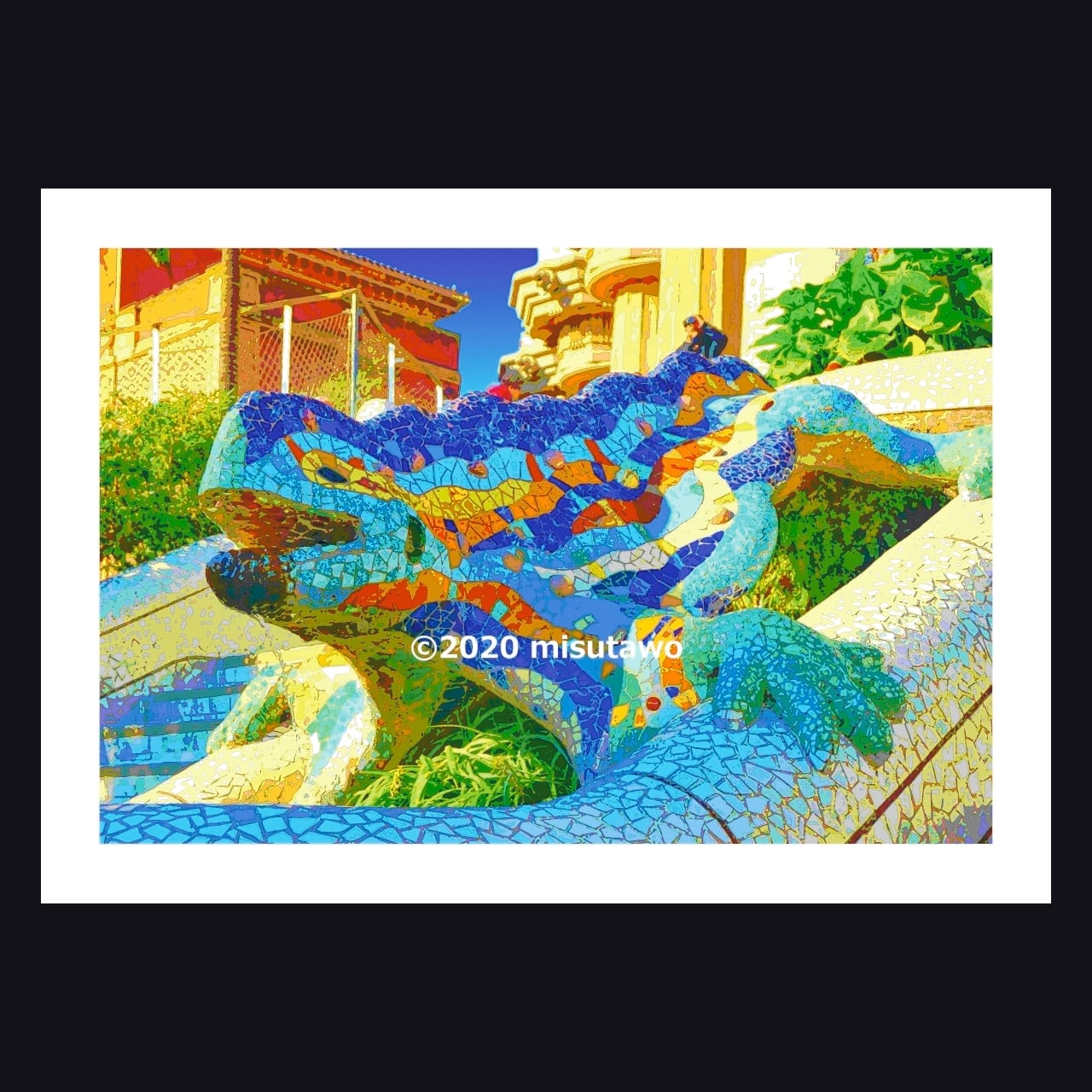 スペイン バルセロナのグエル公園トカゲの噴水を、色鮮やかなグラフィックアートにしたポスターです。