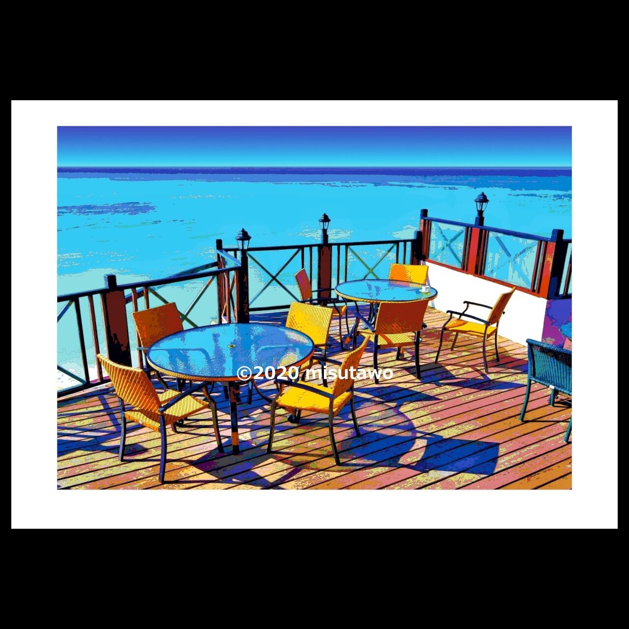 リゾート感のある海沿いのレストランの風景を、色鮮やかなグラフィックアートにしたポスターです。
