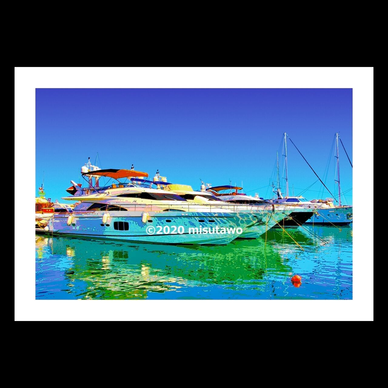リゾート感あふれるマリーナに停泊するクルーザーやヨットを、色鮮やかなグラフィックアートにしたポスターです。