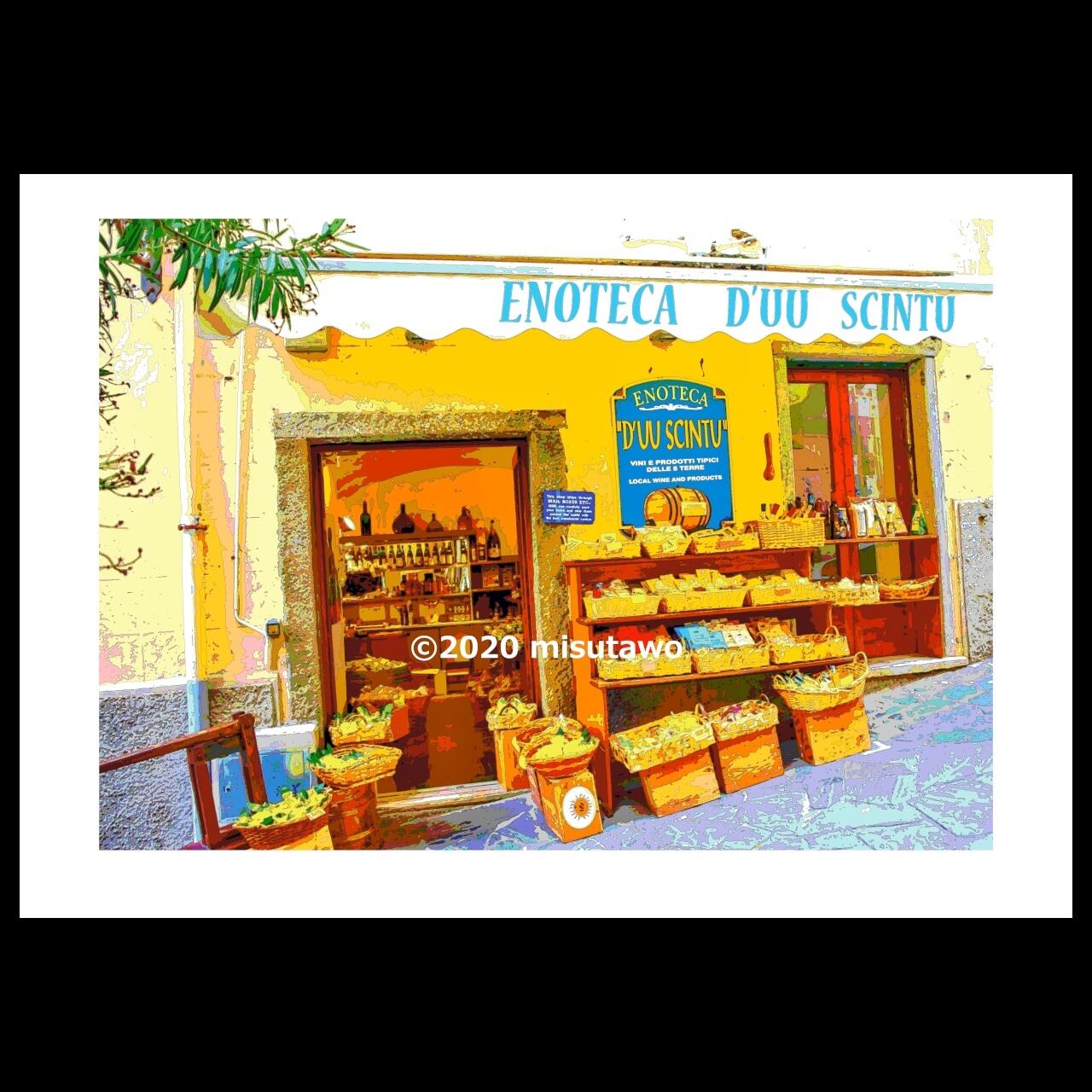 イタリア チンクエ・テッレにあるマーケットを、色鮮やかなグラフィックアートにしたポスターです。