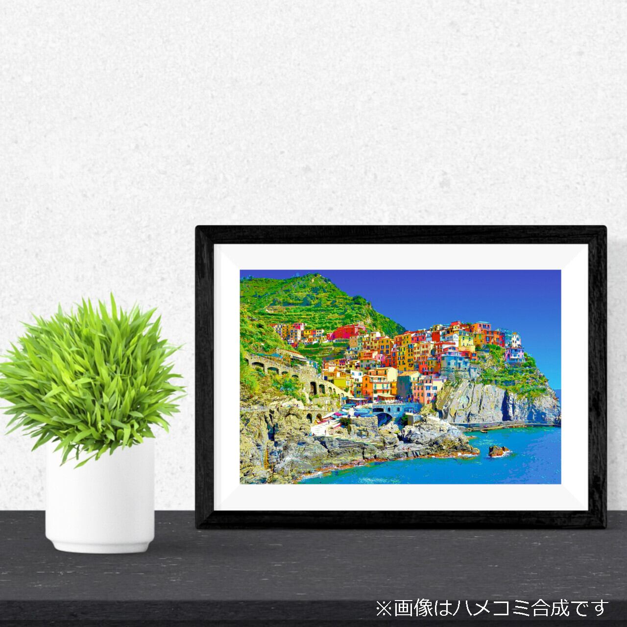 イタリア チンクエ・テッレの街並みを、色鮮やかなグラフィックアートにしたポスターです。