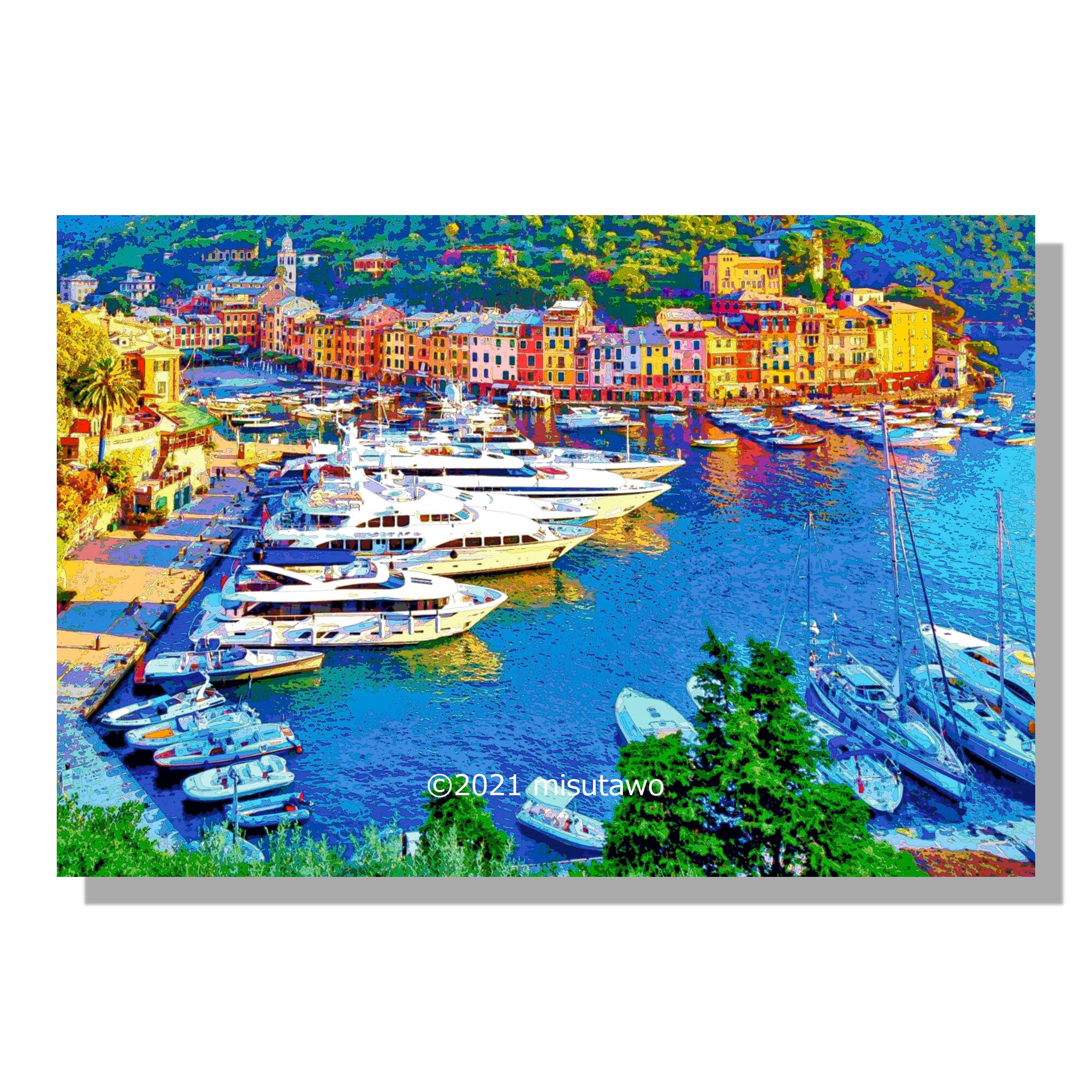 イタリア リグーリア州ジェノヴァ県の高級リゾート地ポルトフィーノの風景を、色鮮やかなグラフィックアートにしたポスターです。