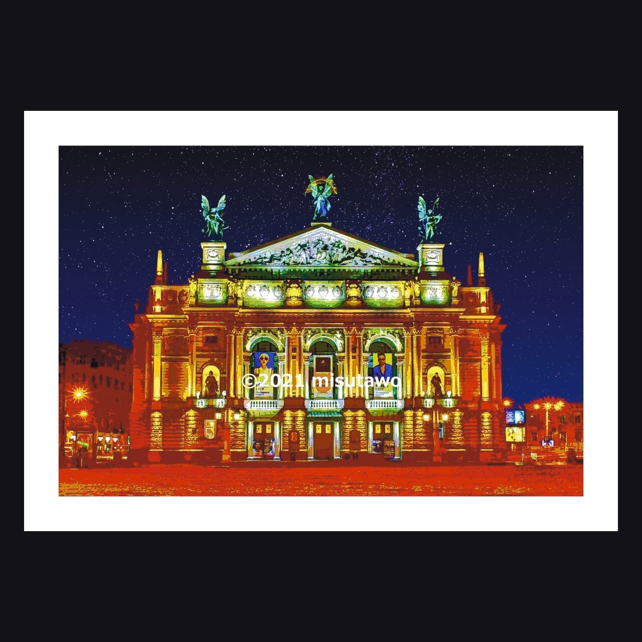 ウクライナのリヴィウにあるリヴィウ・オペラ・バレエ劇場(正式名称:ウクライナ・リヴィウのソロミヤ・クルシェルニツカ国立歌劇場)を、色鮮やかなグラフィックアートにしたポスターです。