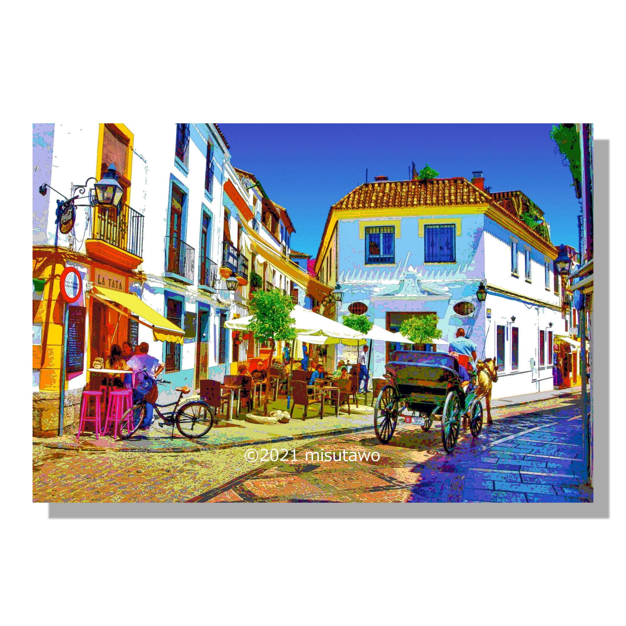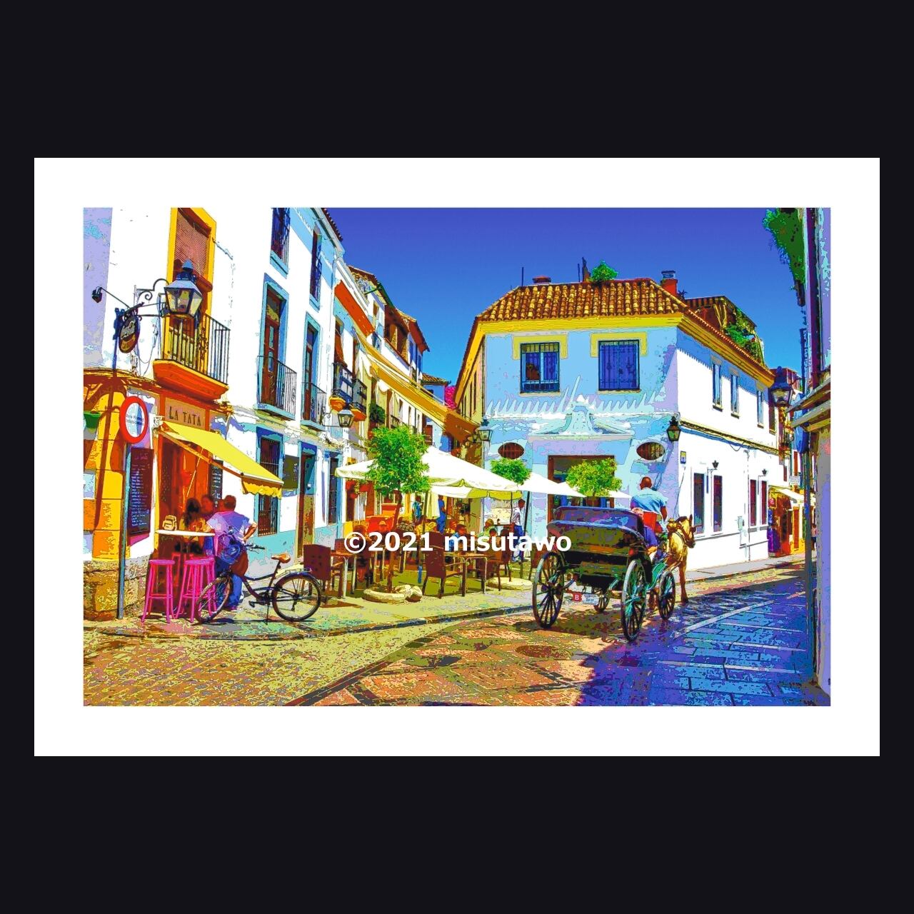 スペイン アンダルシア州コルドバの街角を、色鮮やかなグラフィックアートにしたポスターです。