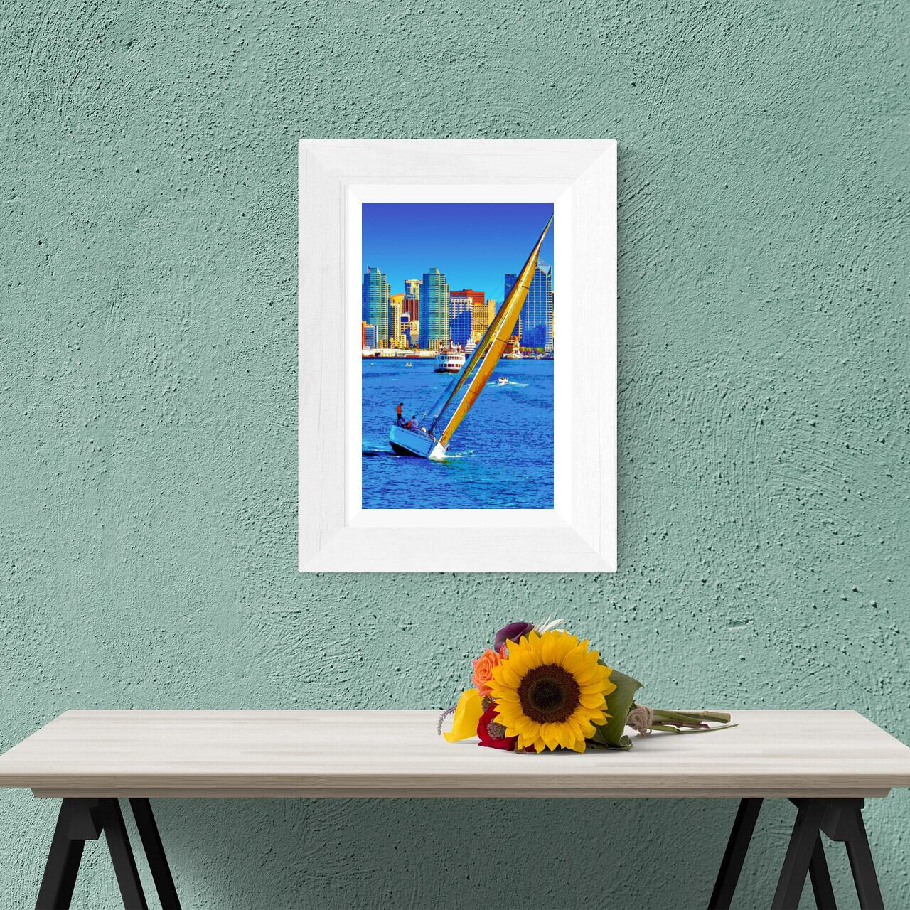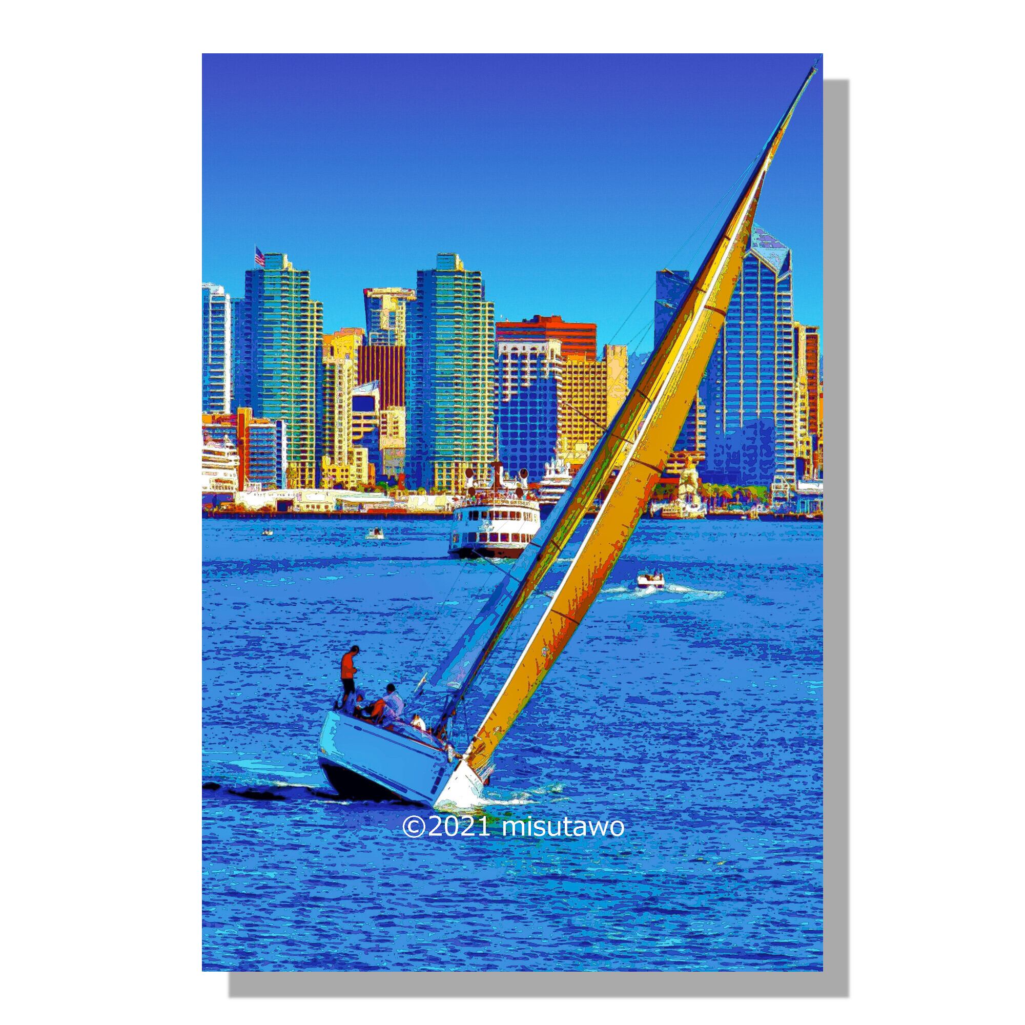 アメリカ サンディエゴの街とヨットを、色鮮やかなグラフィックアートにしたポスターです。