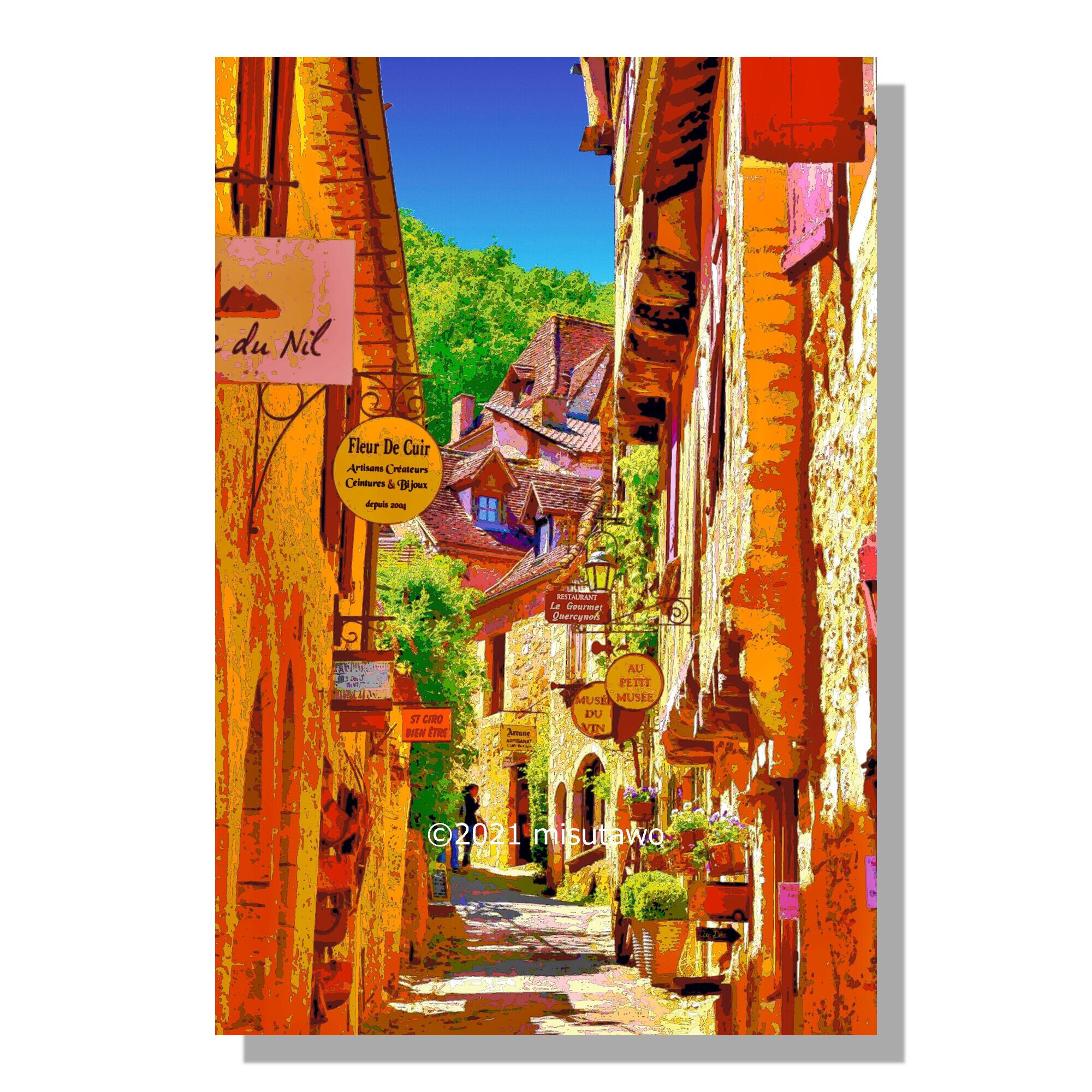 フランス南西部にある中世の街並みが美しい村サン・シルウ・ラポピーの路地を、色鮮やかなグラフィックアートにしたポスターです。