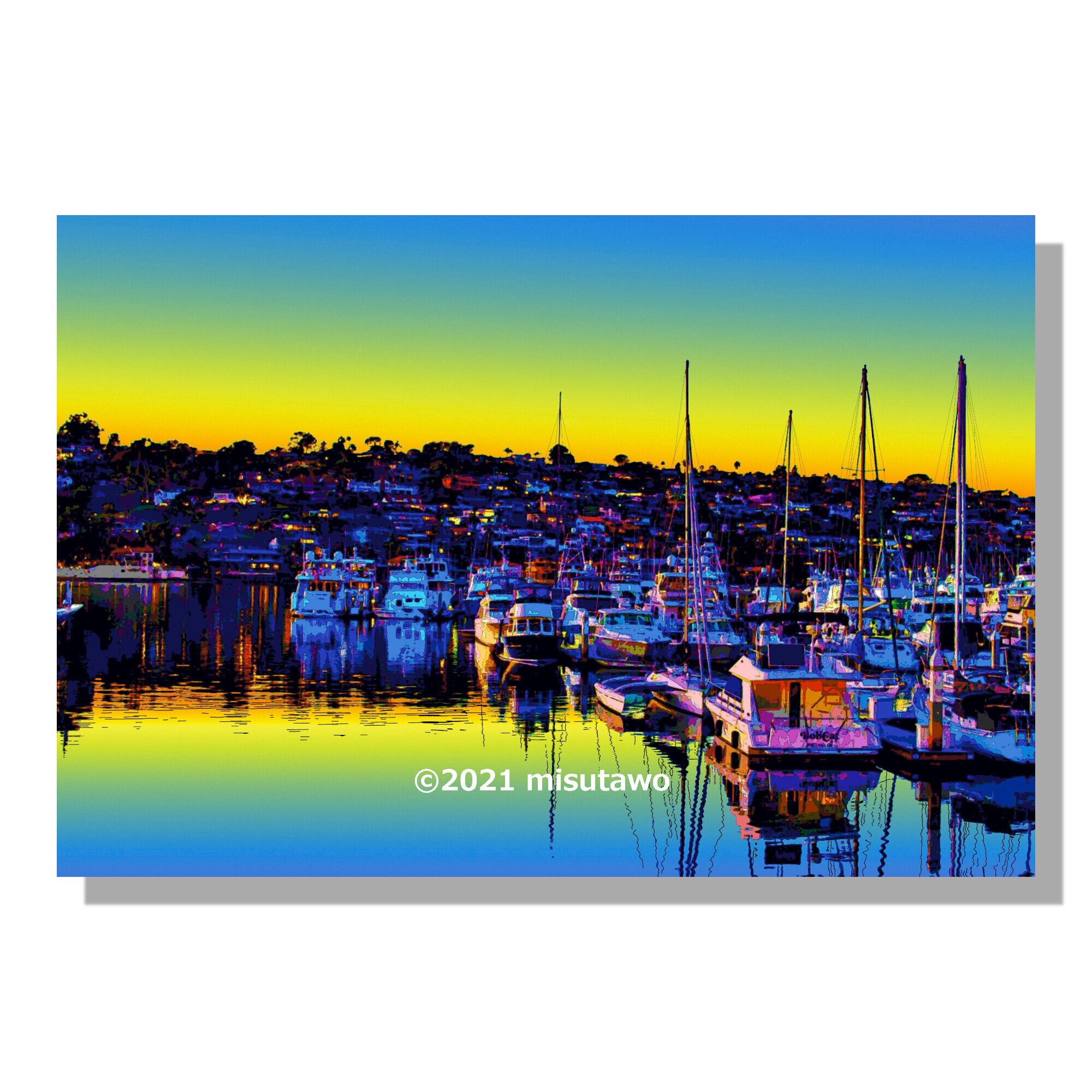 アメリカ カリフォルニア州の夕暮れのマリーナを、色鮮やかなグラフィックアートにしたポスターです。