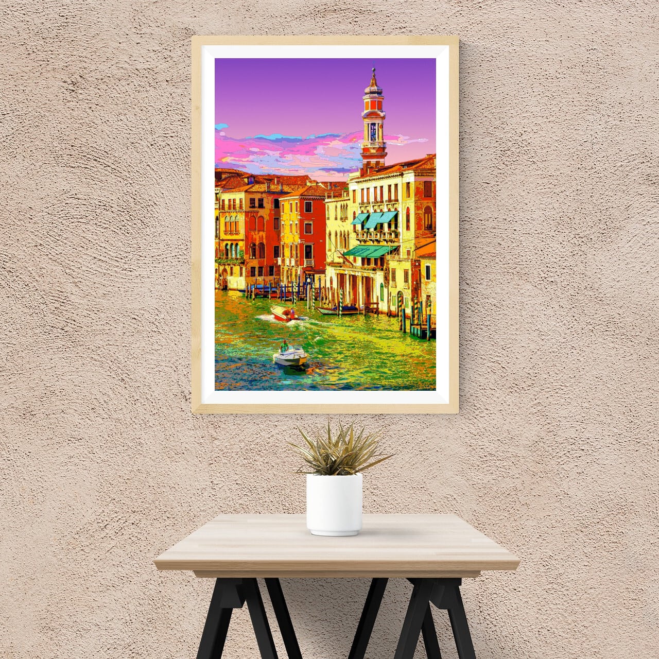 イタリア ヴェネツィアの夕暮れを、色鮮やかなグラフィックアートにしたポスターです。