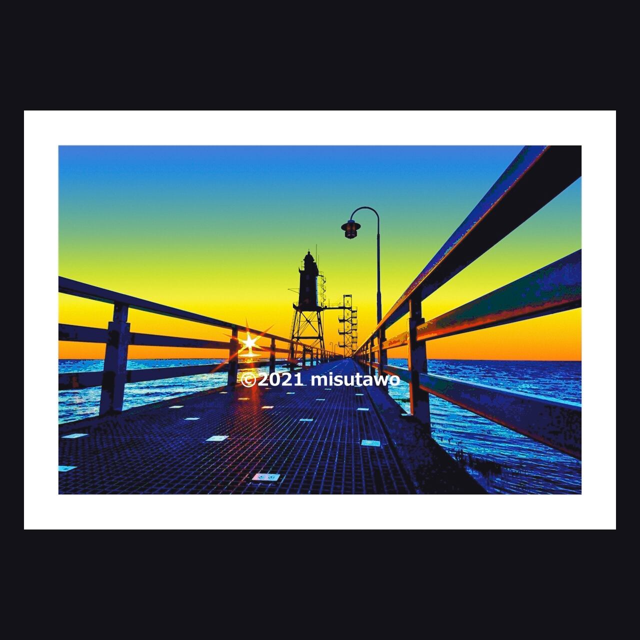 ドイツ 夕暮れのワッデン海の灯台を、色鮮やかなグラフィックアートにしたポスターです。