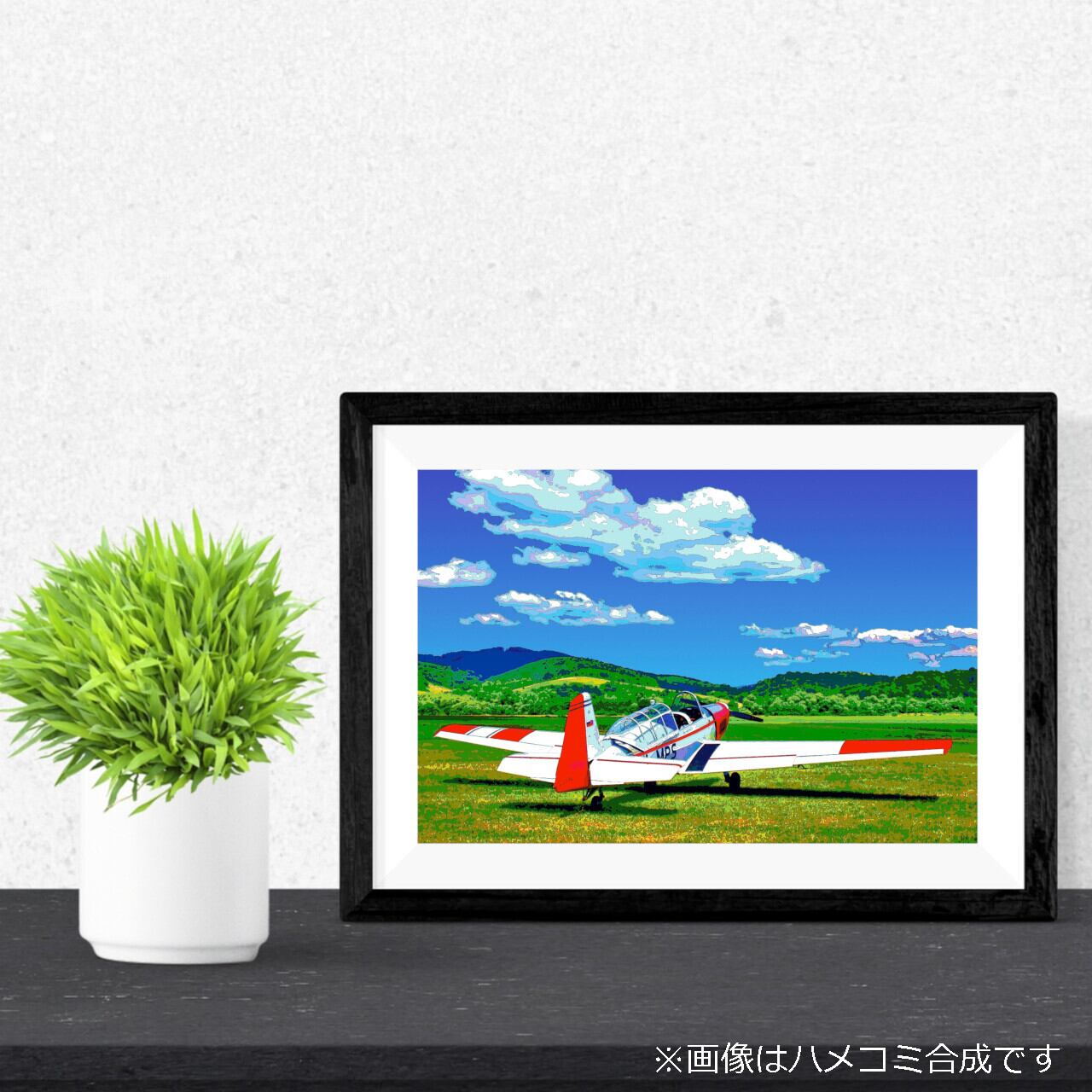 草原の飛行機を、色鮮やかなグラフィックアートにしたポスターです。