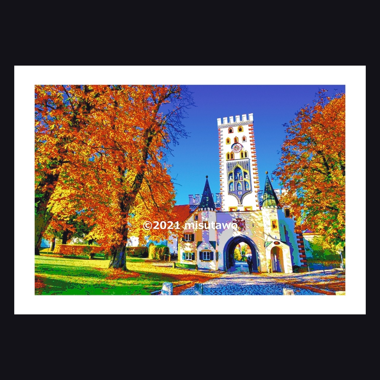 ドイツ ランツベルクのバイエルン門を、色鮮やかなグラフィックアートにしたポスターです。