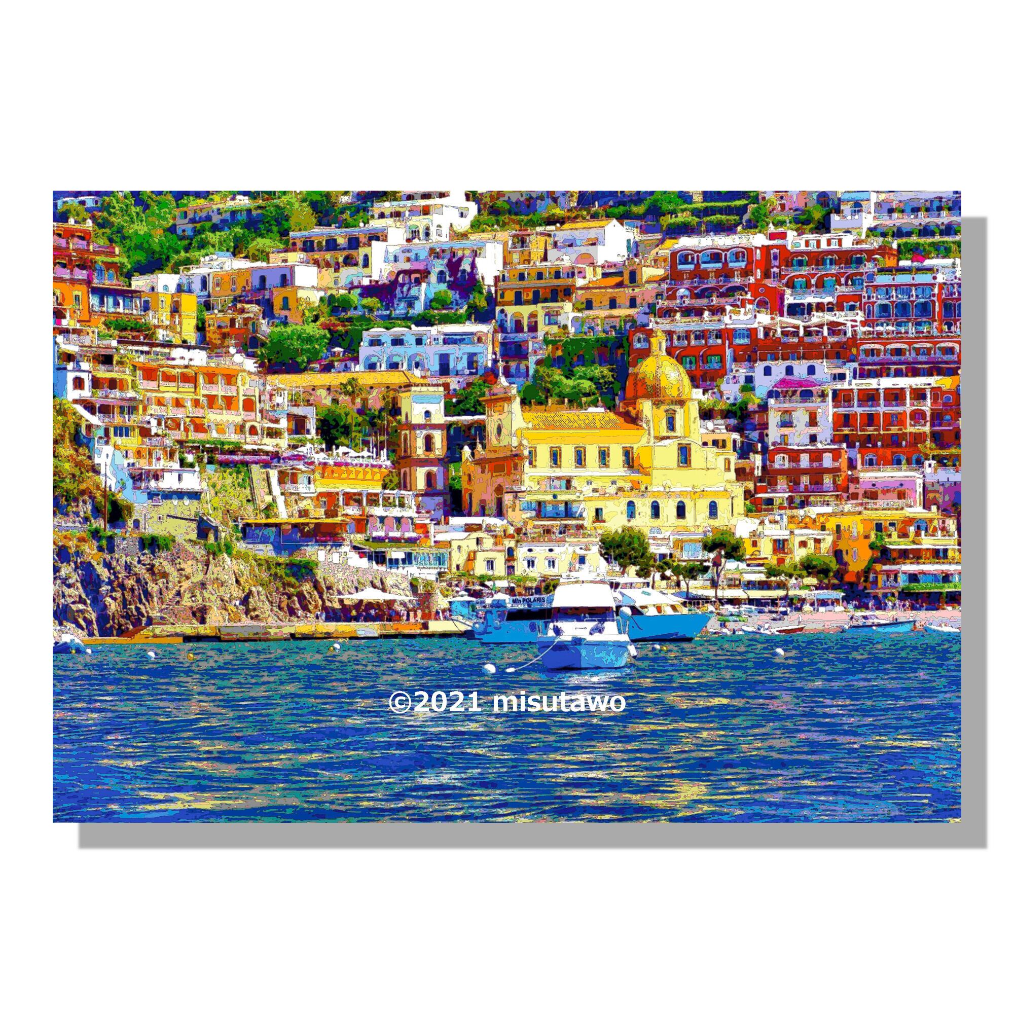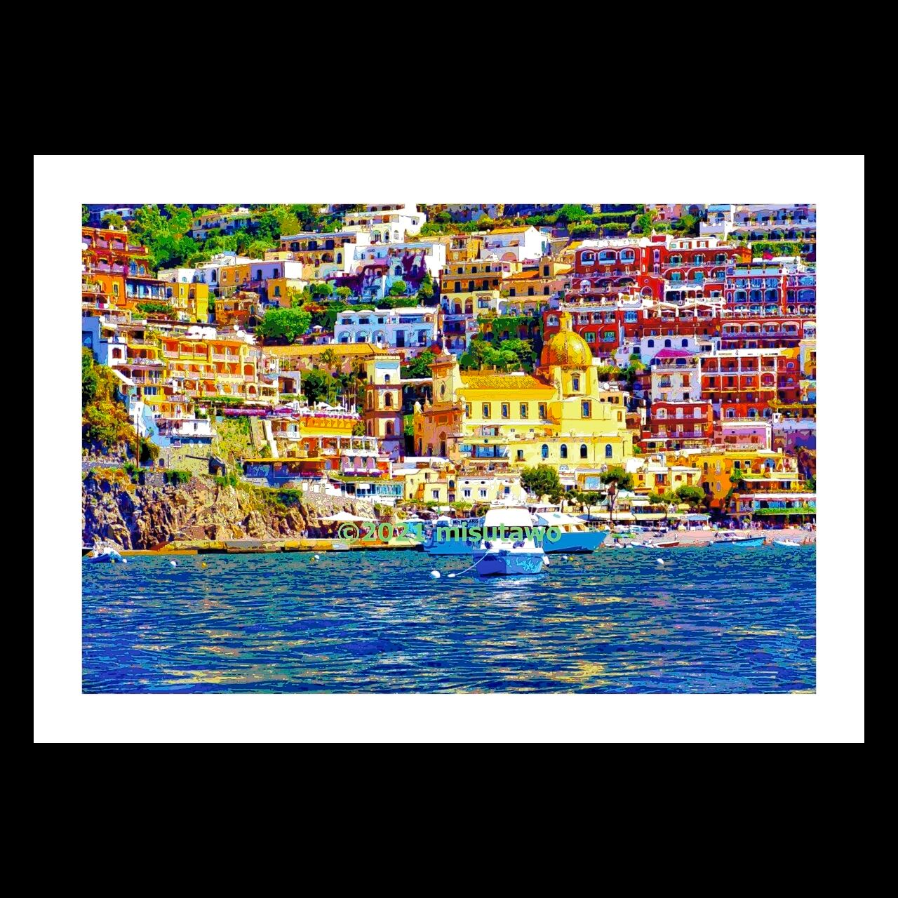 イタリア ポジターノの海岸とサンタ・マリア・アッスンタ教会を、色鮮やかなグラフィックアートにしたポスターです。