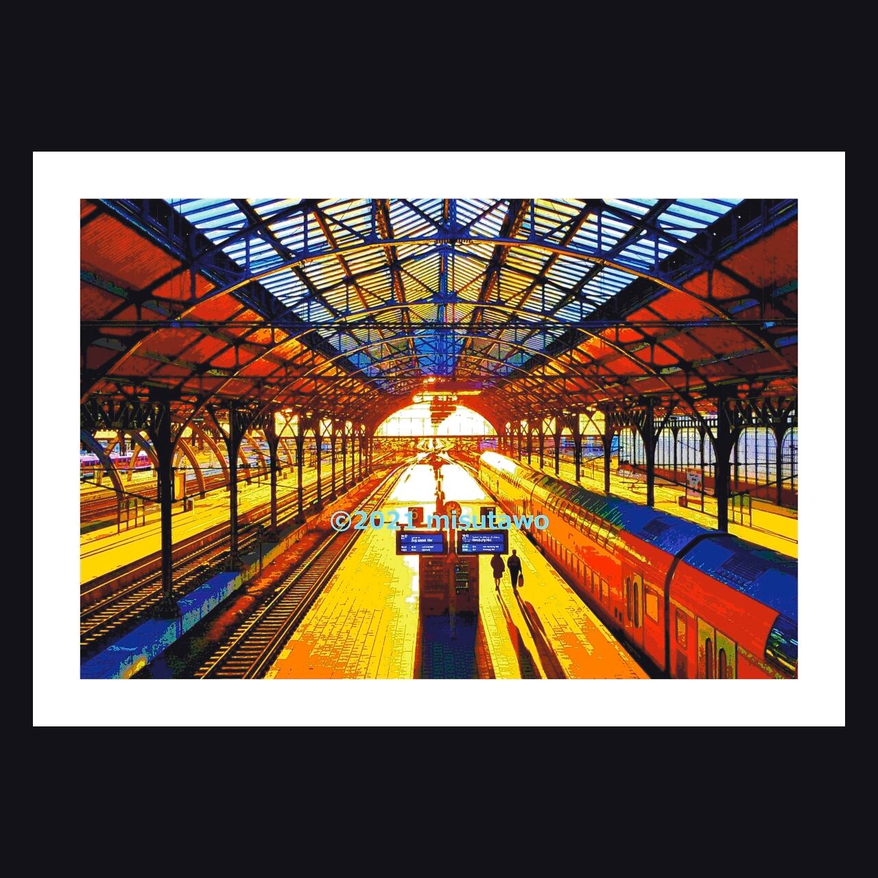ドイツ 夕暮れのリューベック中央駅のホームを、色鮮やかなグラフィックアートにしたポスターです。