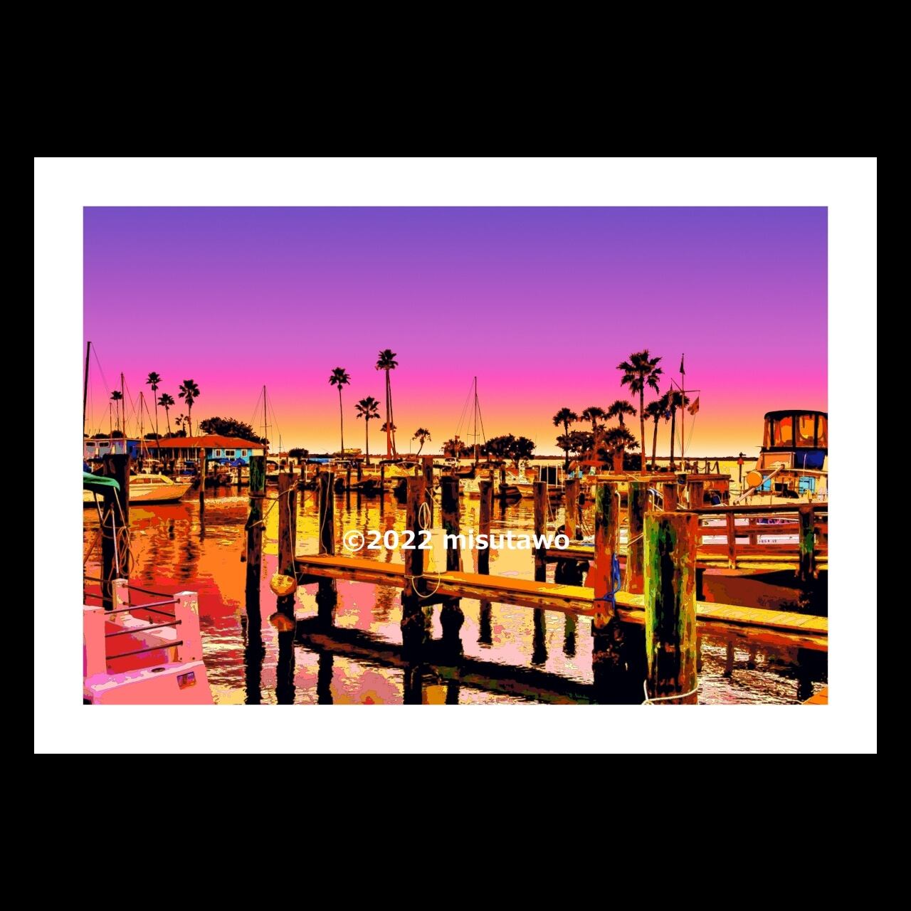 フロリダ 夕暮れのマリーナを、色鮮やかなグラフィックアートにしたポスターです。