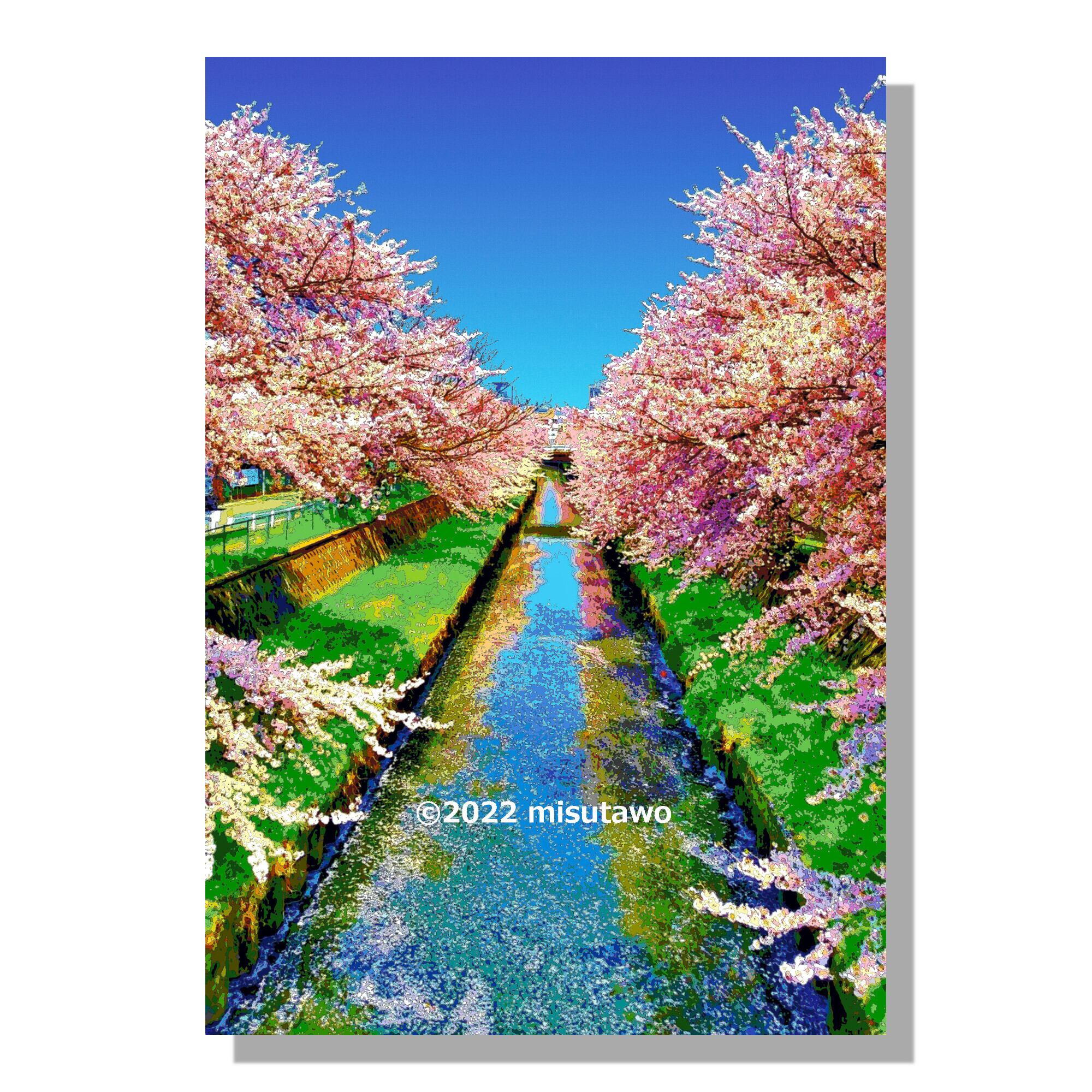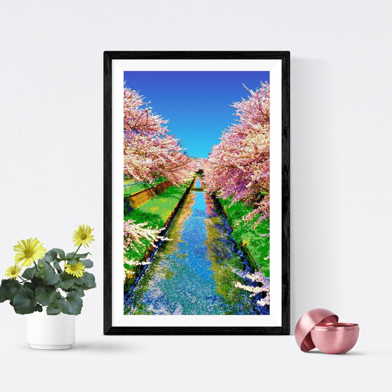 春の小川を色鮮やかなグラフィックアートにしたポスターです。