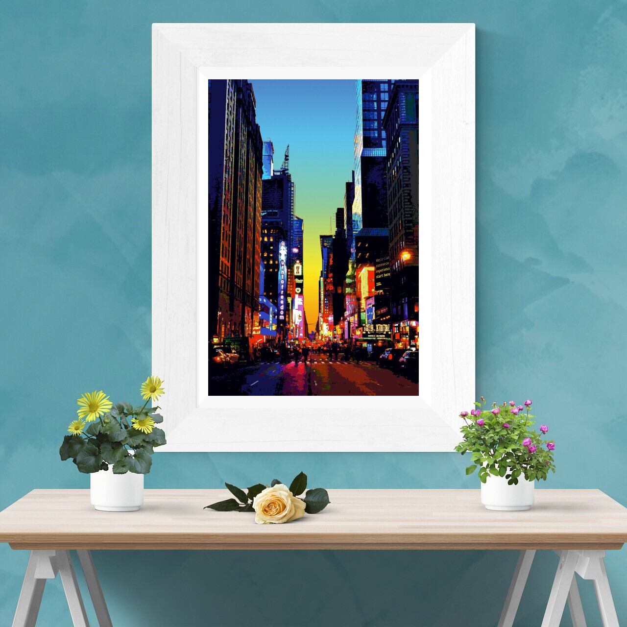 ニューヨーク 7thアベニューの夕暮れを、色鮮やかなグラフィックアートにしたポスターです。
