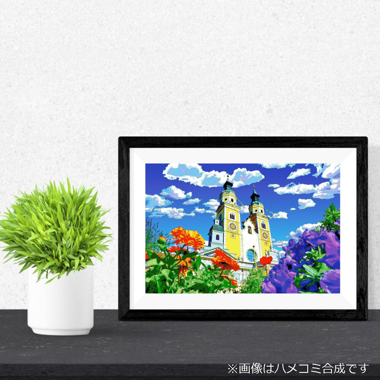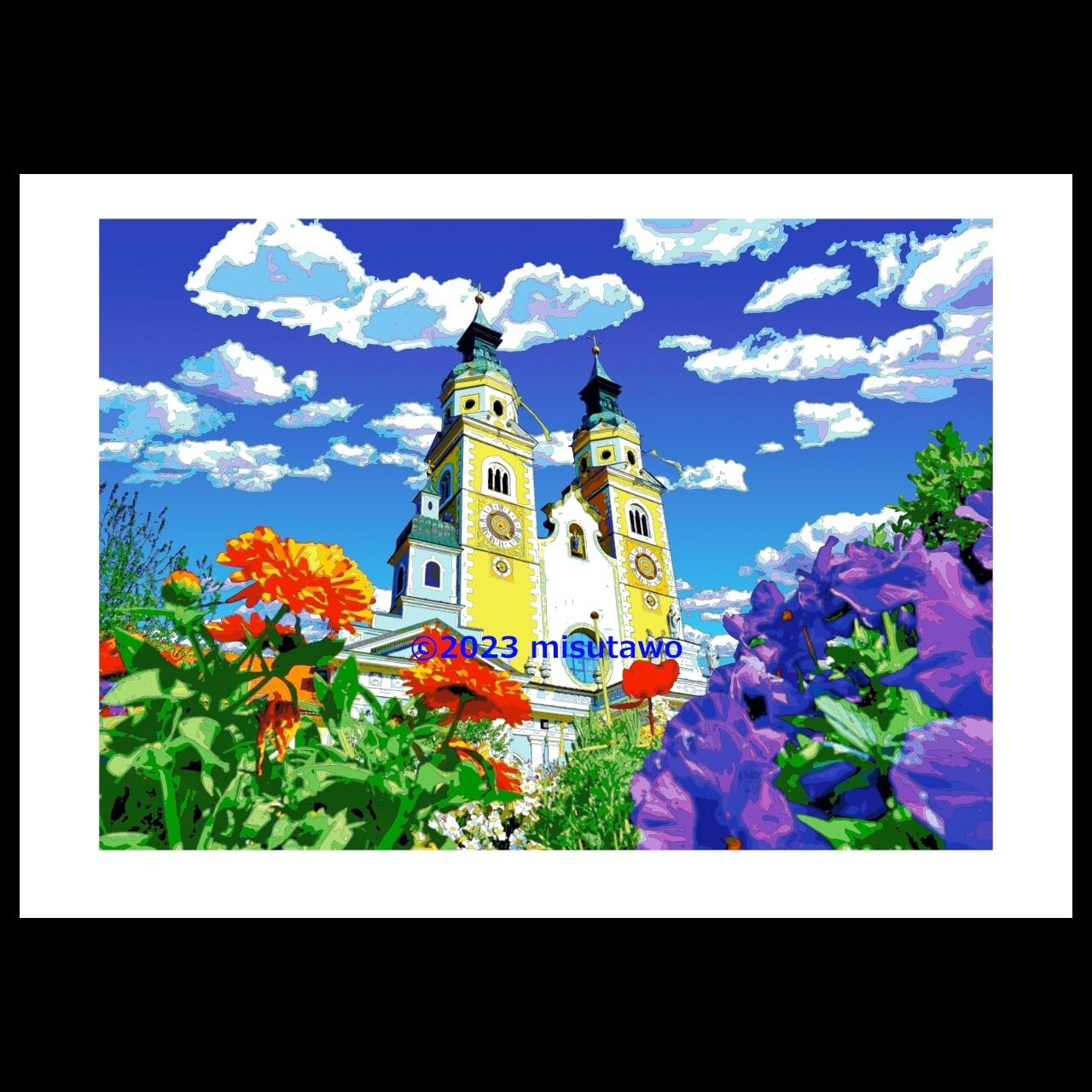 イタリア ブリクセン大聖堂と春の花を、色鮮やかなグラフィックアートにしたポスターです。