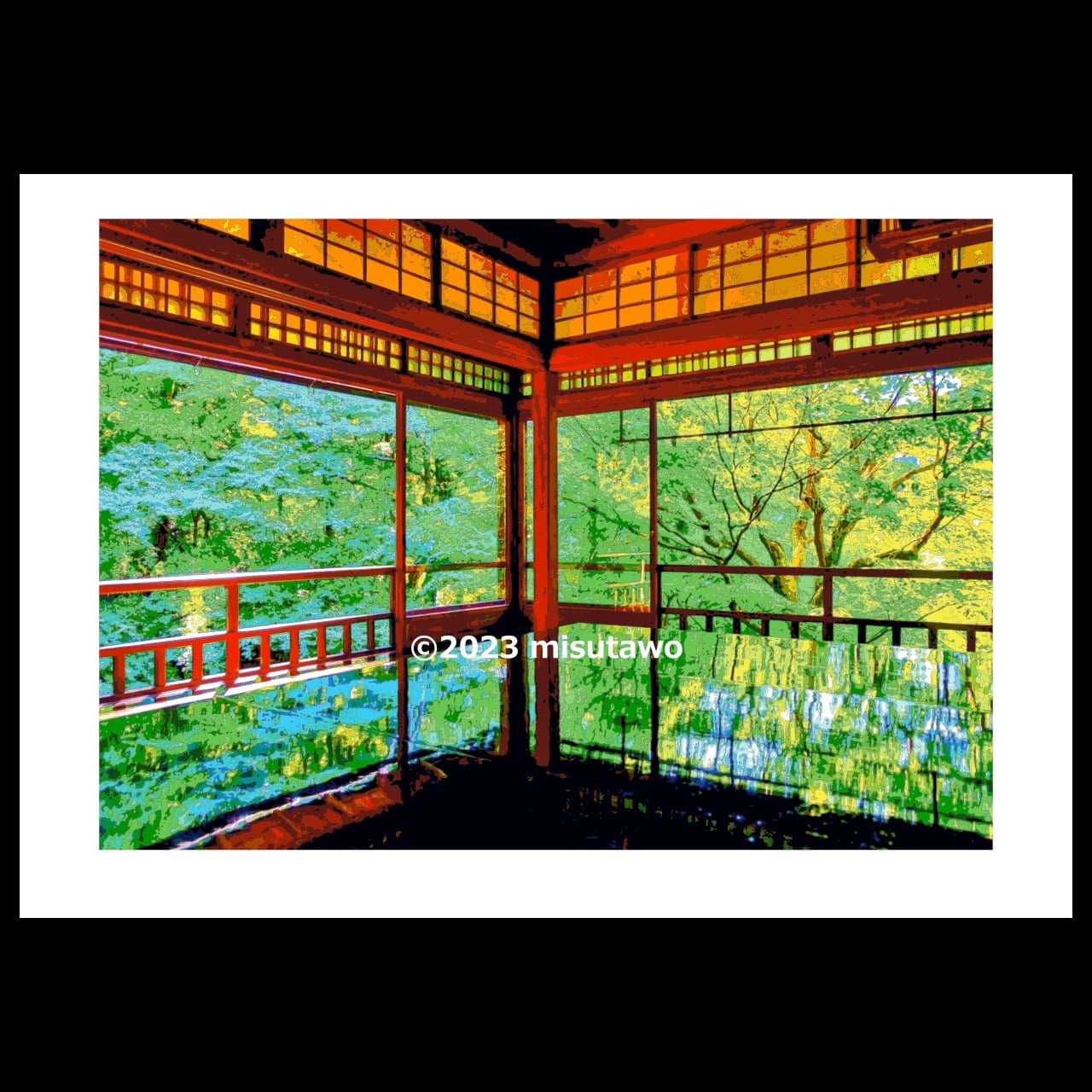 京都 瑠璃光院の青もみじを、色鮮やかなグラフィックアートにしたポスターです。