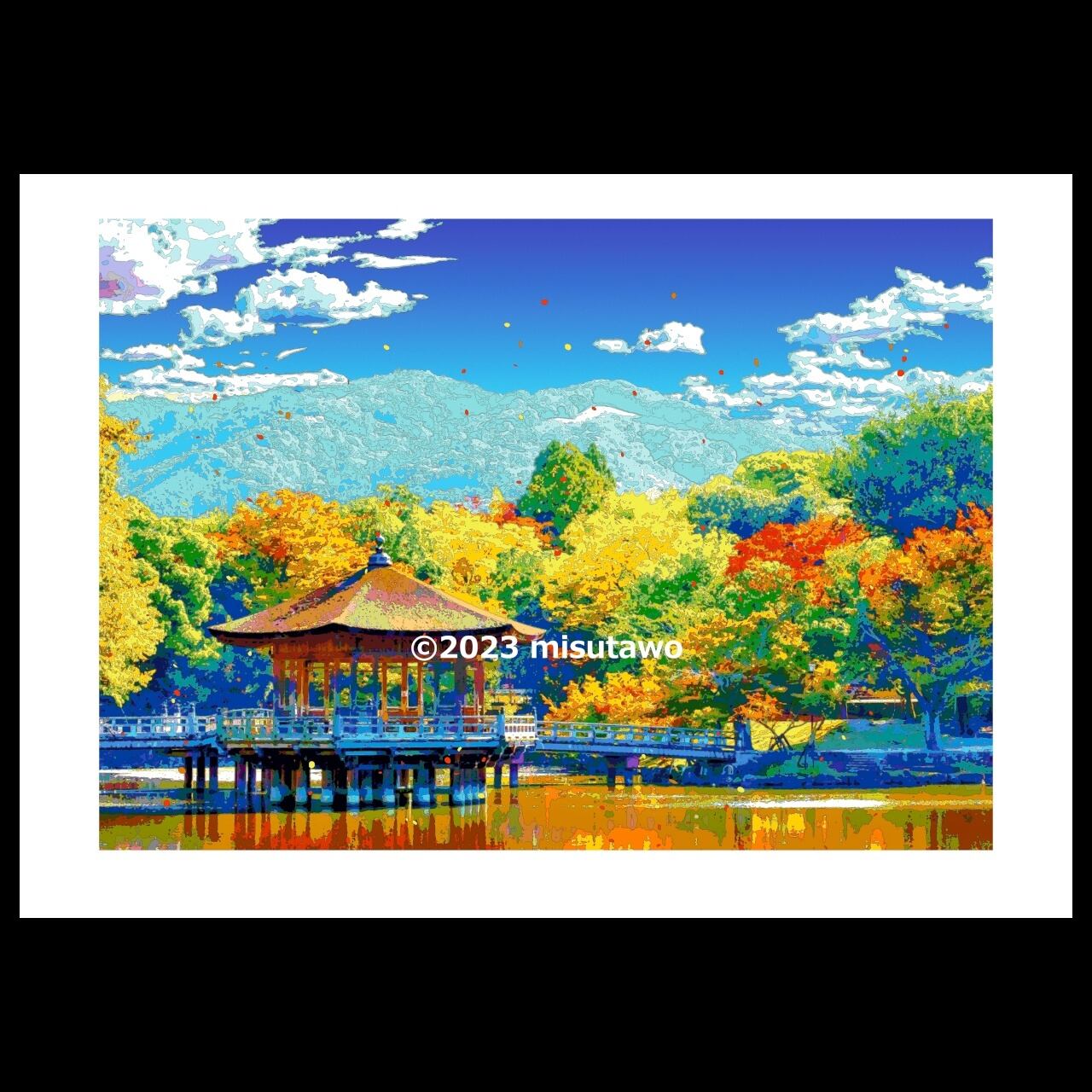 奈良 秋の浮見堂を、色鮮やかなグラフィックアートにしたポスターです。